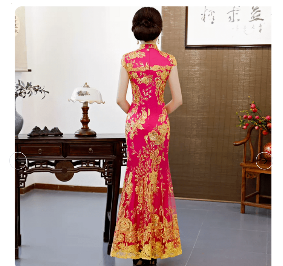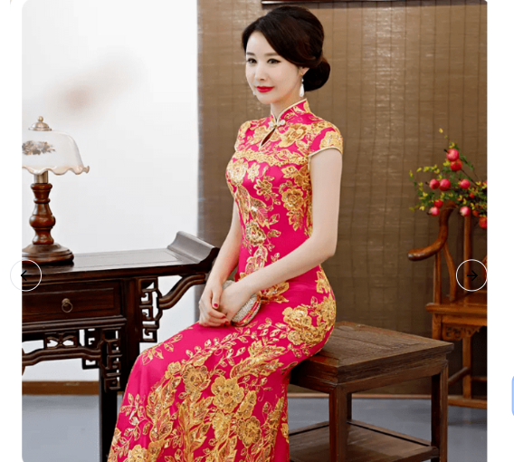 立ち襟とスリットが特徴的な本格的なチャイナドレスの美しいフォルムで、格式高い場面にも映える洗練されたデザイン