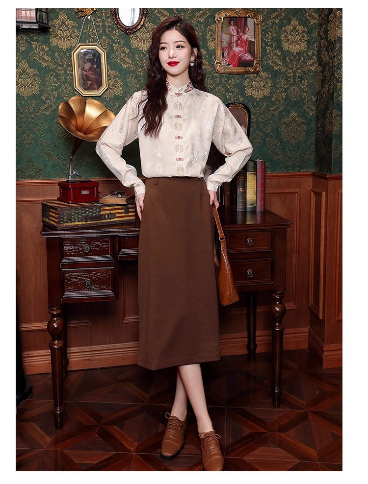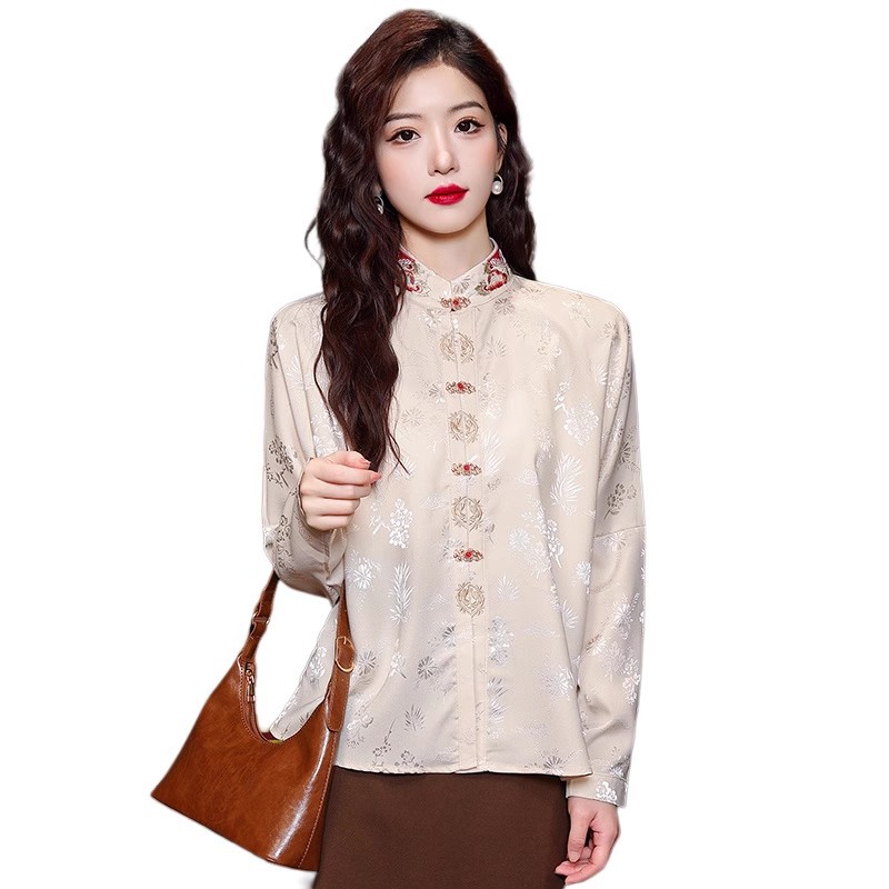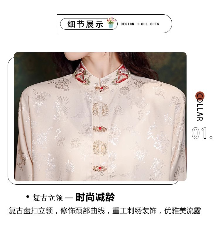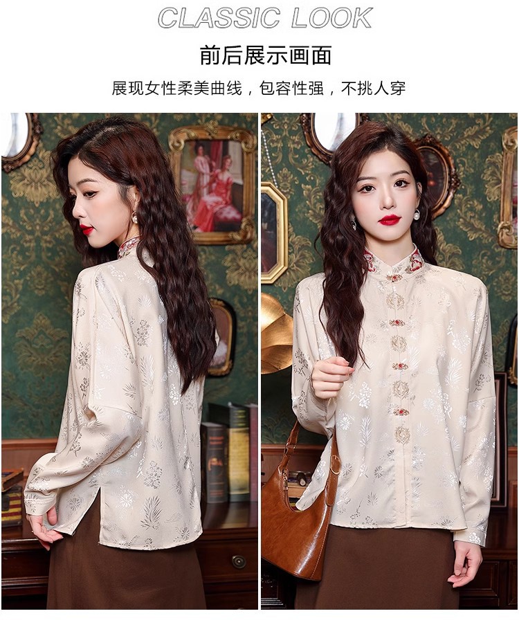 上品な光沢のある生地に繊細な刺繍が施された、エレガントなチャイナカラーのブラウス。伝統的なデザインにモダンなエッセンスを加え、洗練された雰囲気を演出。ボタンディテールがアクセントに。