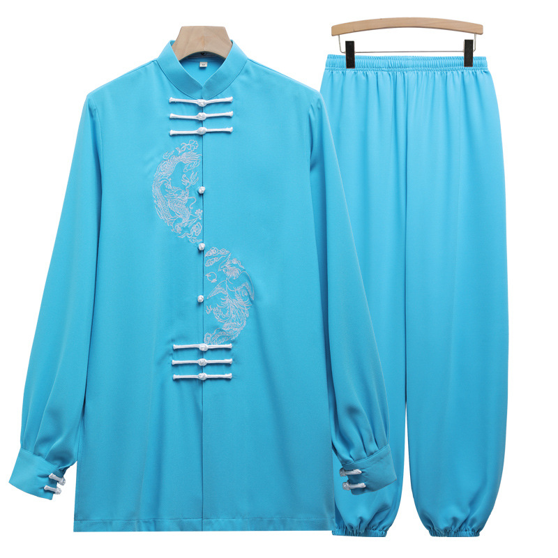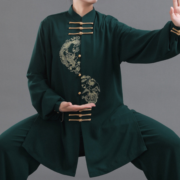伝統的な太極拳をイメージしたチャイナ服のセットアップです。 上衣には躍動感あふれる龍の刺繍が施され、チャイナボタンが装いに格調高さを添えます。 ゆったりとしたシルエットで動きやすく、太極拳や気功などの練習着としても最適です。 上下が揃ったセットアップなので、届いたその日からすぐにお使いいただけます。 普段着としても個性的な装いを楽しめる一着です。