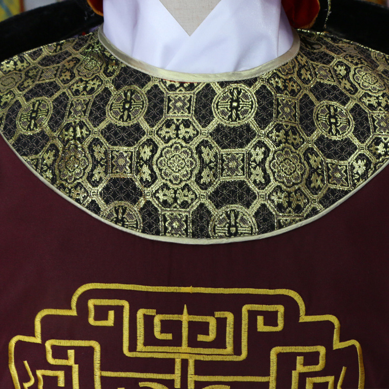 胸元と袖口に施された華やかな金糸刺繍の幾何学模様が格式高い雰囲気を演出します。