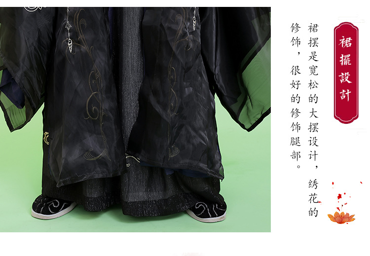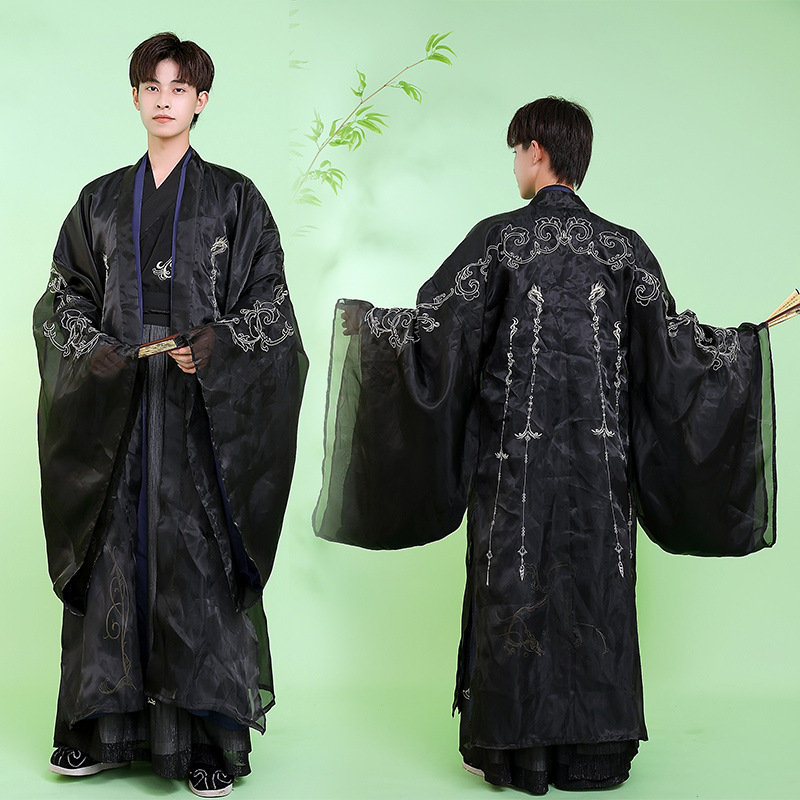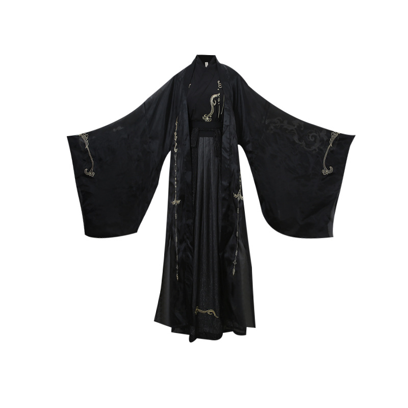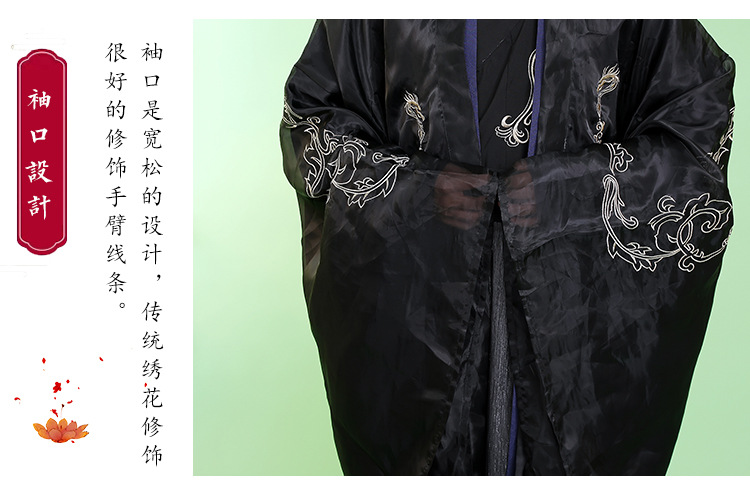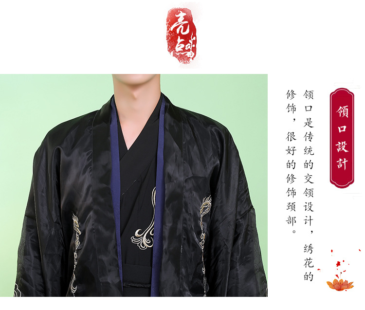 光沢のある上質な生地に龍や雲の紋様を繊細な刺繍で施し、袖口や襟元、背中に優美な装飾を配置しました。