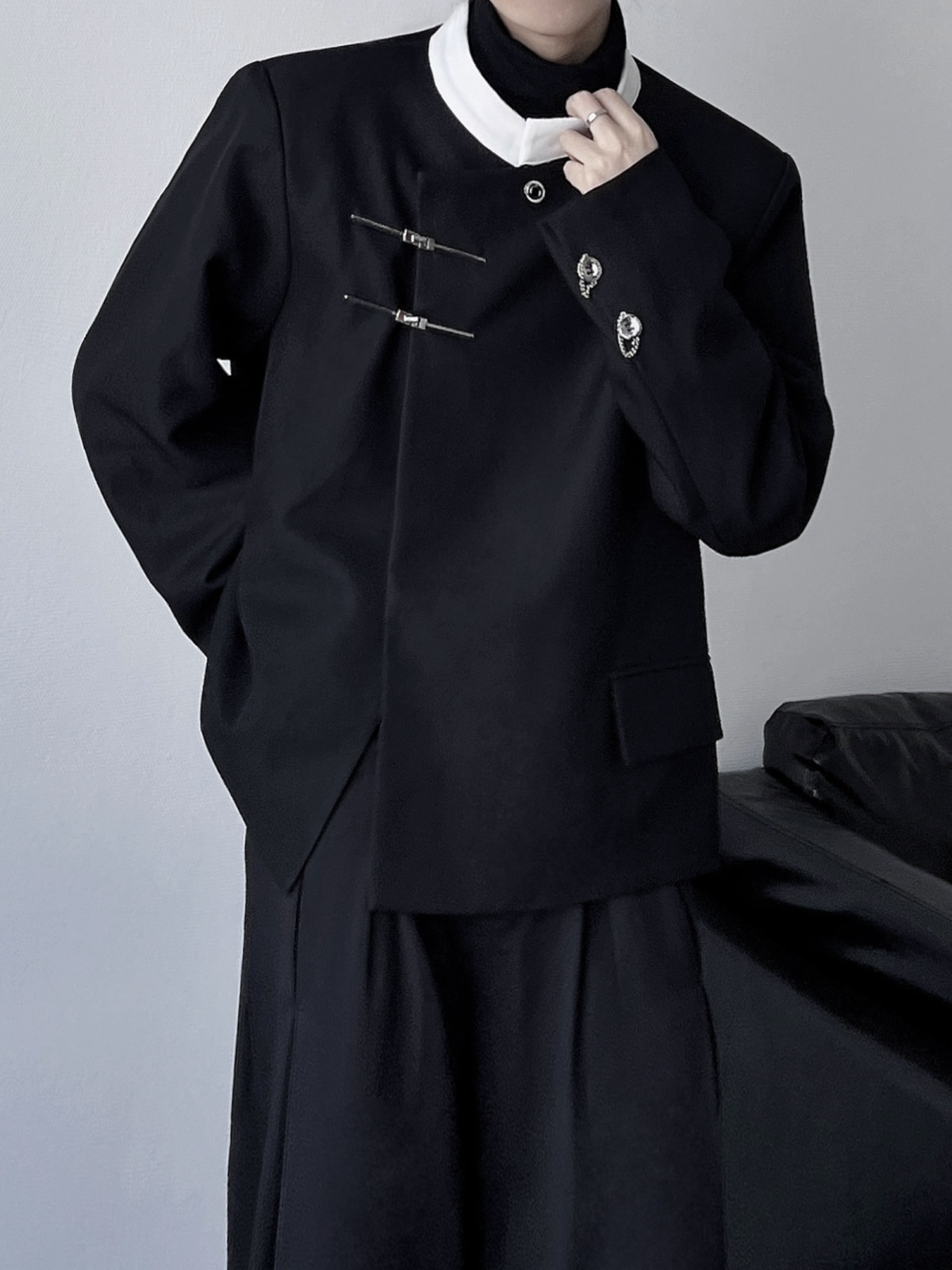 斜めに配置された特徴的な襟元と、装飾的なチャイナボタンがアクセントになっています。