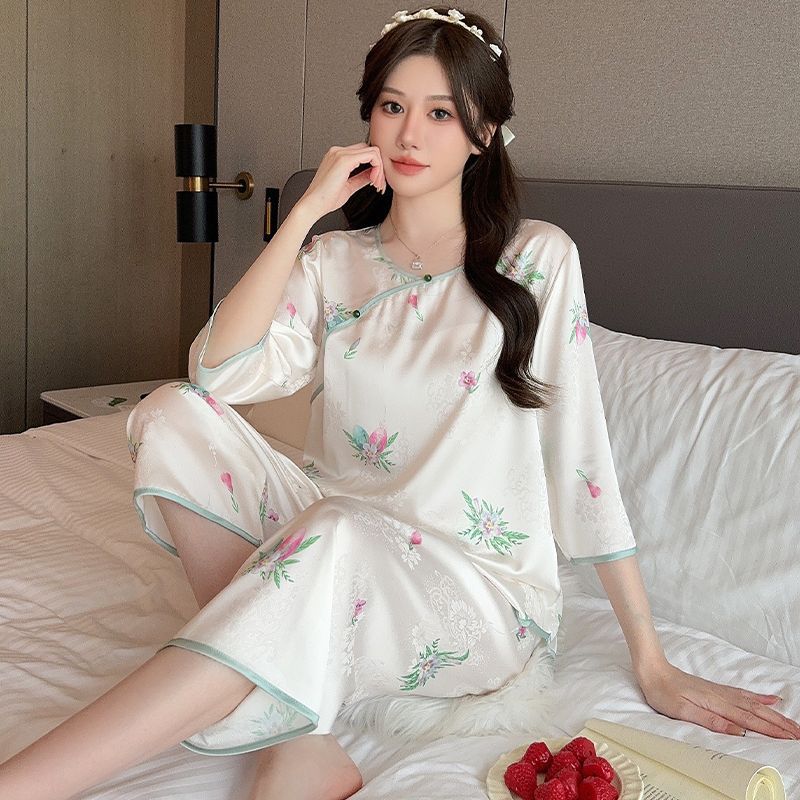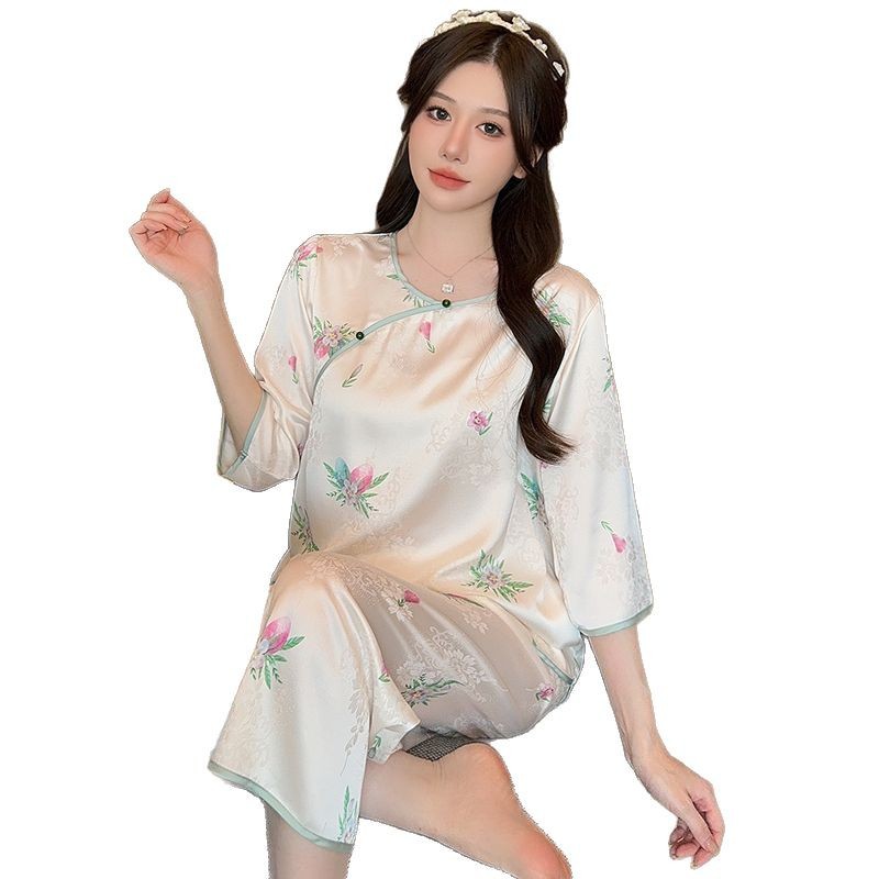 繊細な花鳥刺繍が美しいチャイナ服デザインのパジャマです。