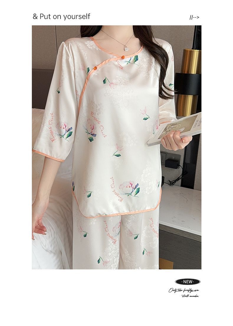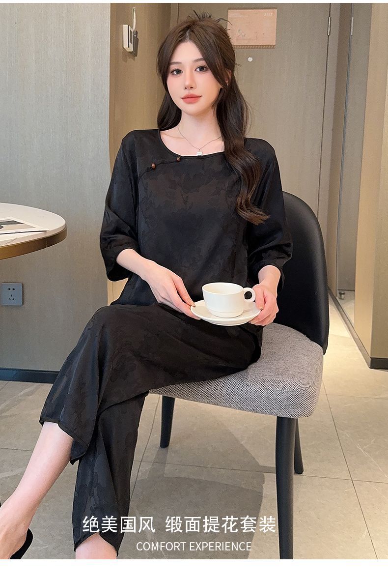 七分袖のゆったりとしたトップスとワイドパンツのセットで、リラックスタイムを優雅に過ごせます。