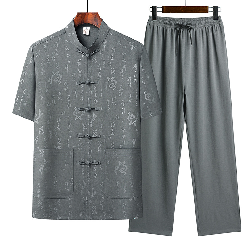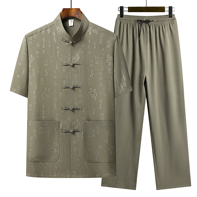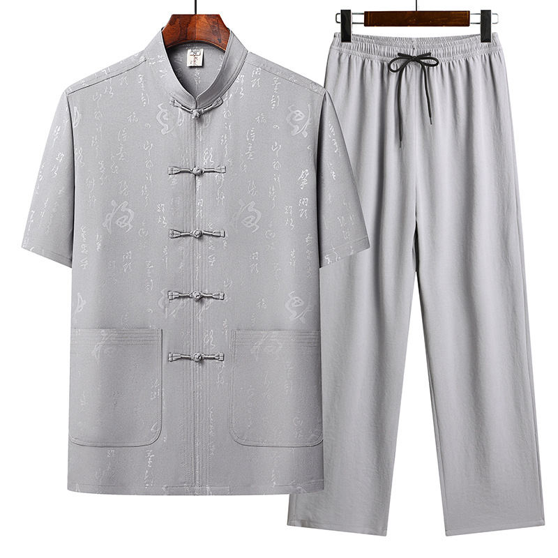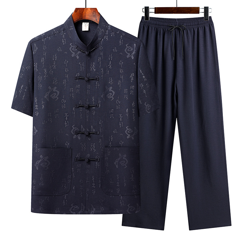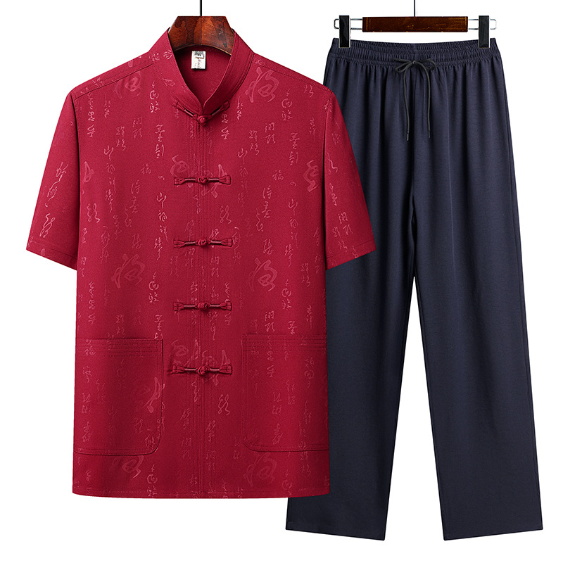 上着には龍の紋様が全体に施され、フロントには唐装ボタンが5つ配置された本格的な仕立てとなっています。