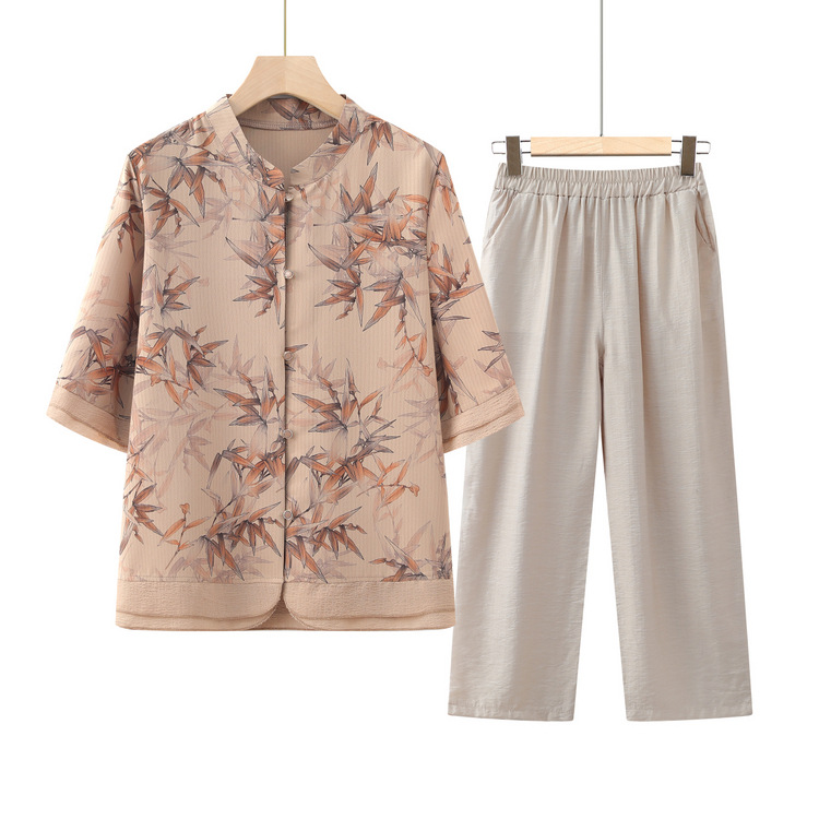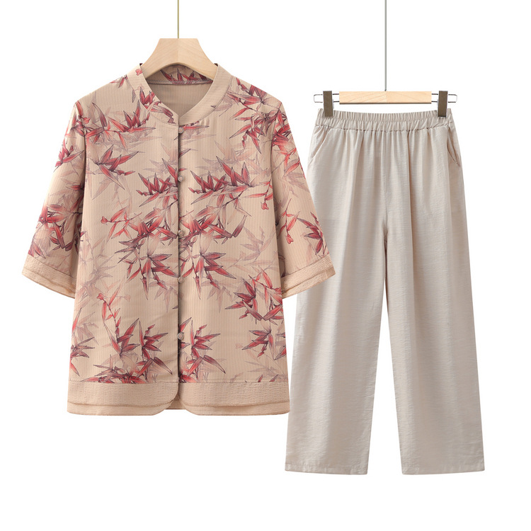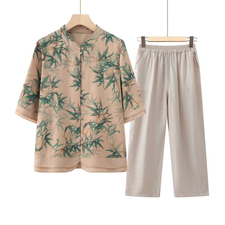 繊細な竹の刺繍が映える上品なチャイナ服のセットアップです。