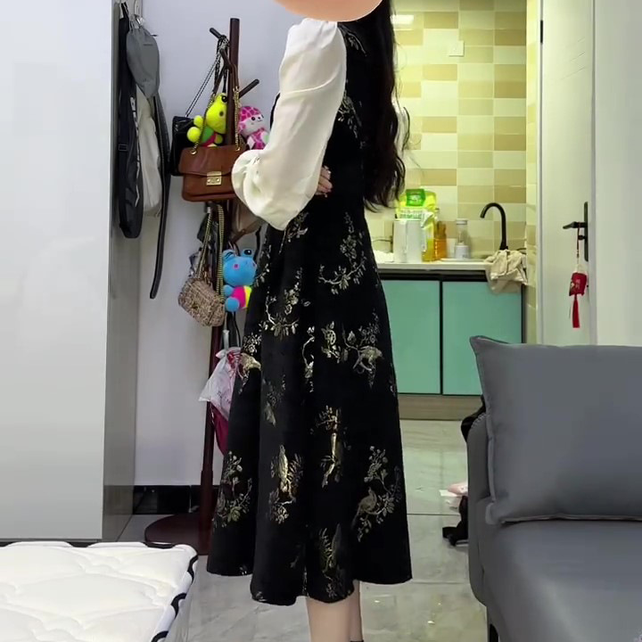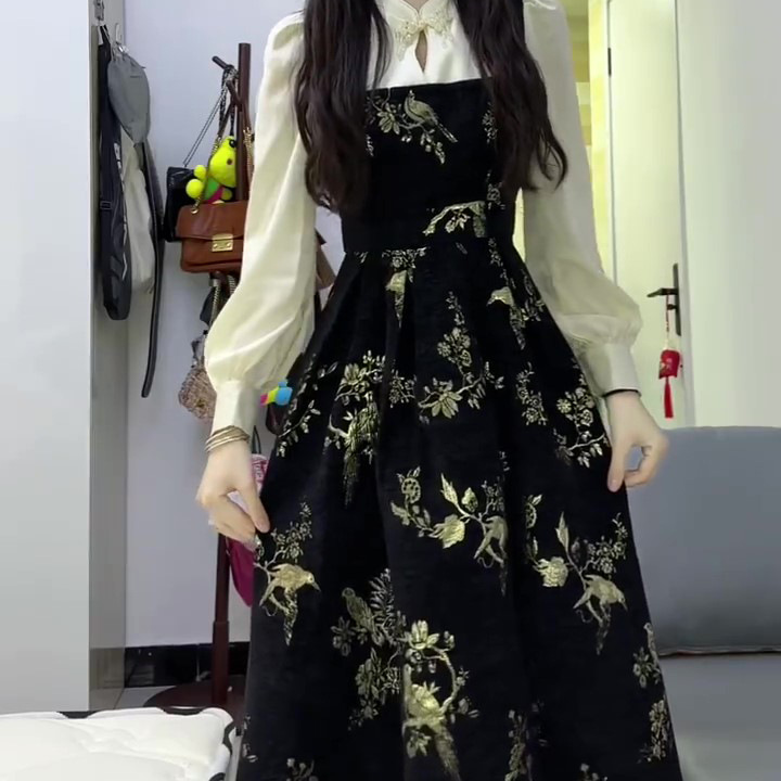 ベルベット調の生地に施された繊細な花鳥刺繍が、エレガントな雰囲気を演出します。
