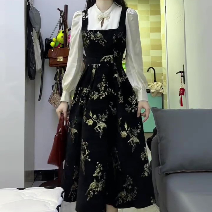 黒地に映える上品な花柄刺繍が全体に施され、エレガントで洗練された印象を演出