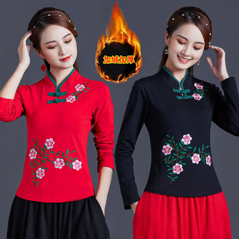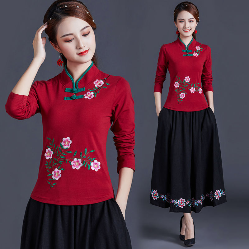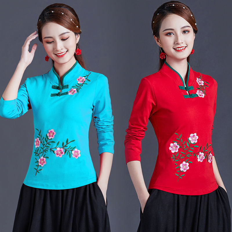 華やかな花刺繍が胸元と裾を彩るチャイナ服デザインのブラウスです。