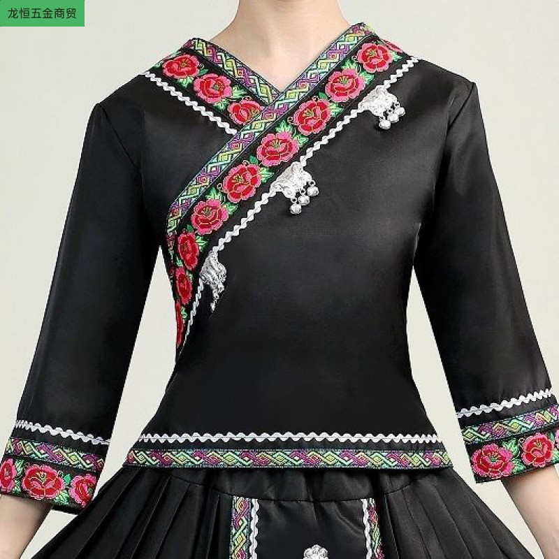 袖口や裾まわりの色とりどりの装飾テープが全体のバランスを整え、洗練された民族衣装の美しさを表現