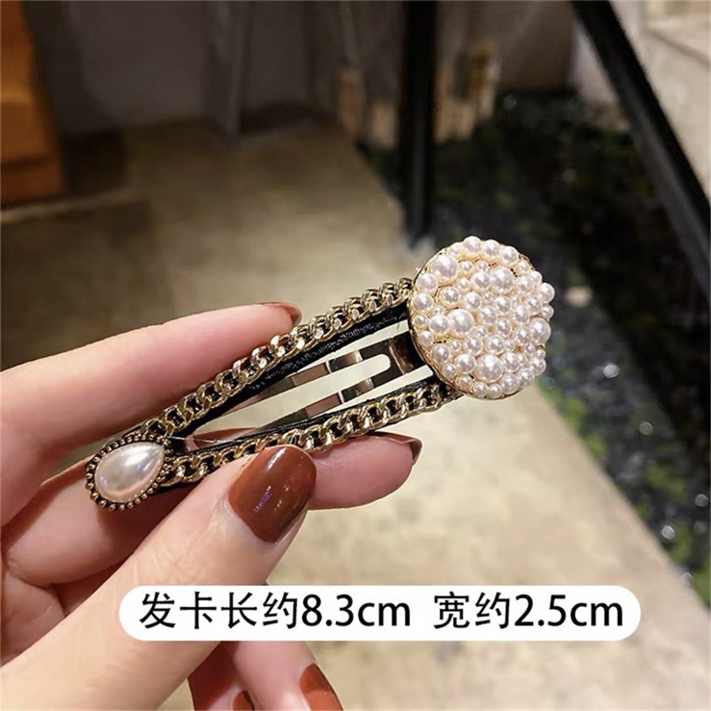 花モチーフや雫型のパールが優雅さを演出し、金属チェーンのデザインがアクセントになっています。