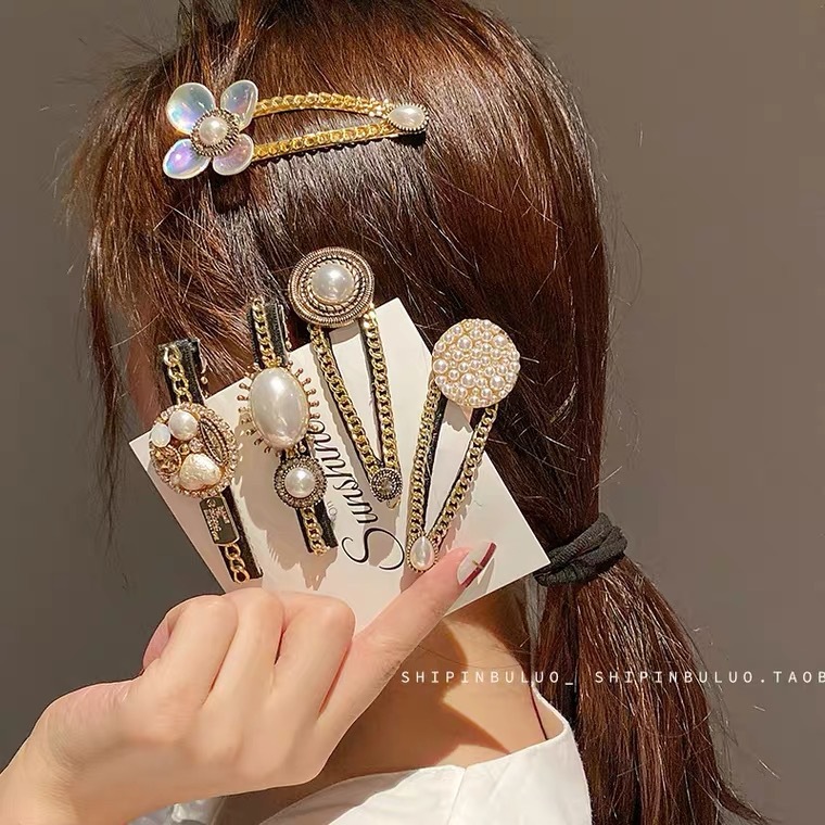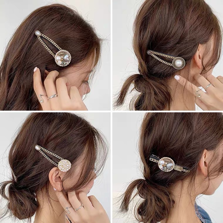 大小のパールをあしらった複数のヘアピンを組み合わせることで、華やかで立体的なヘアアレンジが楽しめます。