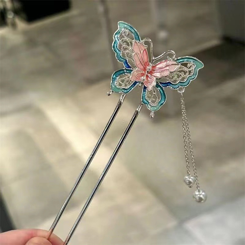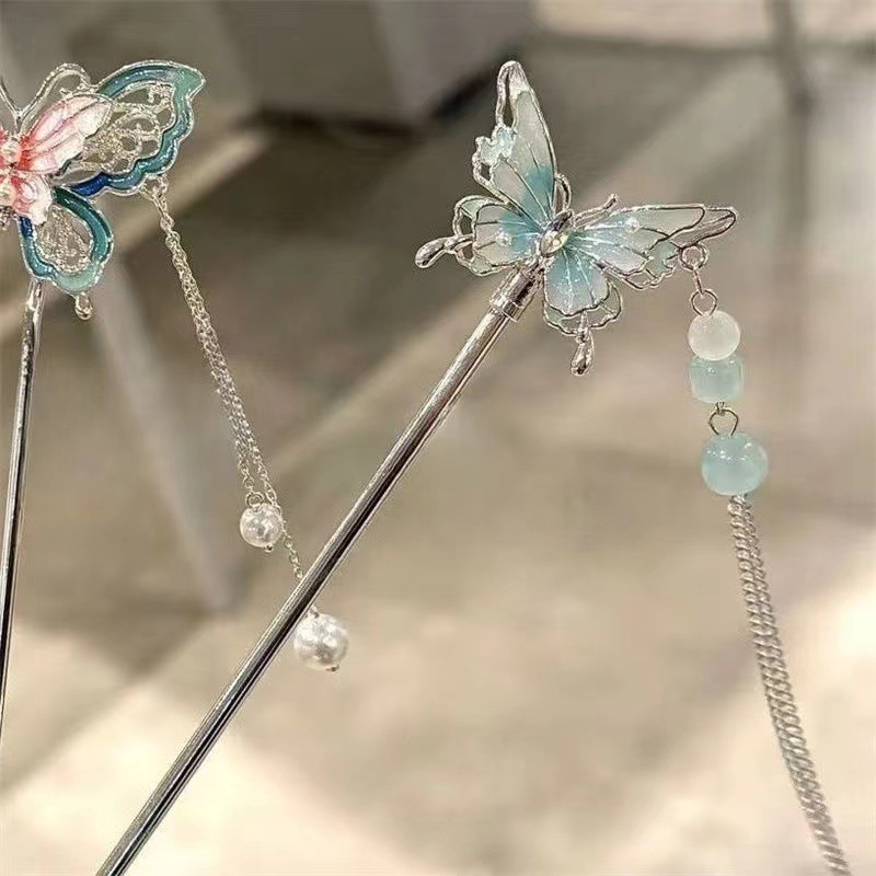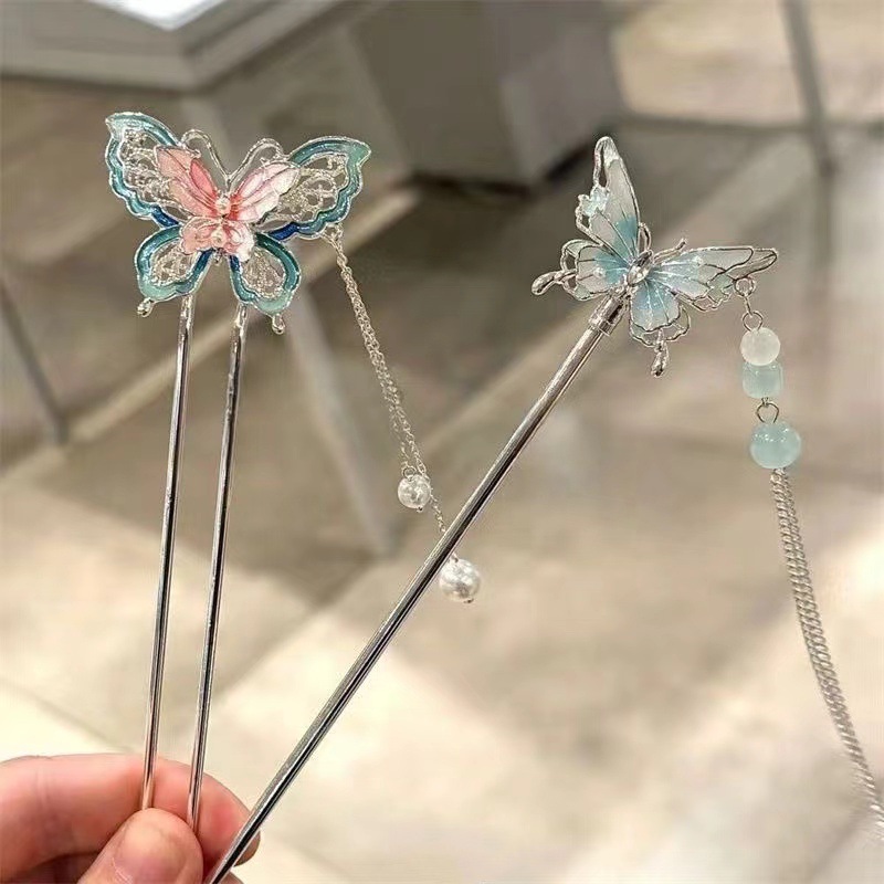 透明感のある蝶々モチーフが美しい二本挿しタイプの髪飾りです。