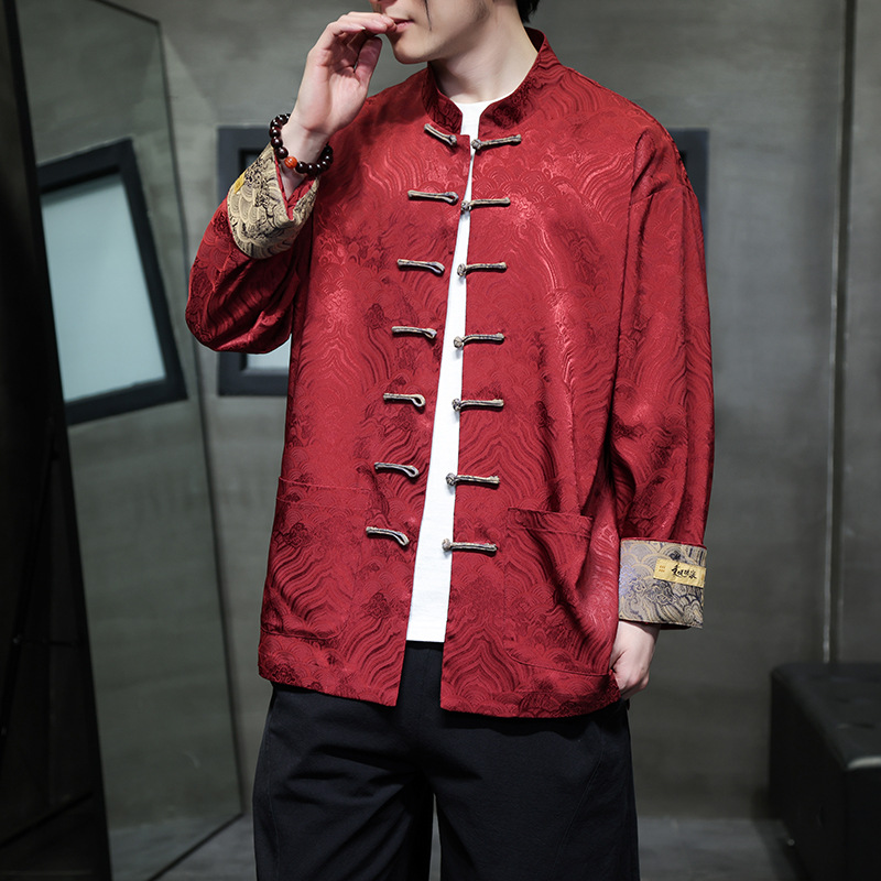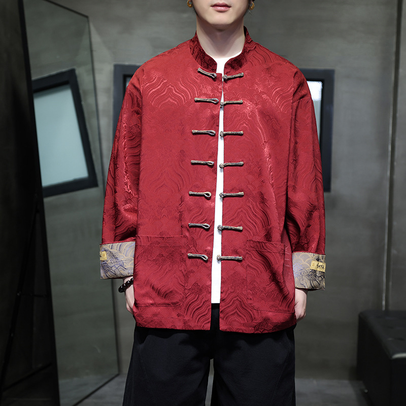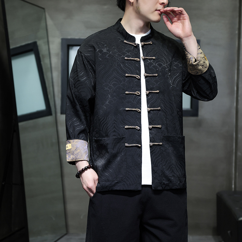 生地全体に施された龍と雲の立体的な刺繍柄が高級感を演出し、フロントの唐装ボタンが東洋の美意識を際立たせます。