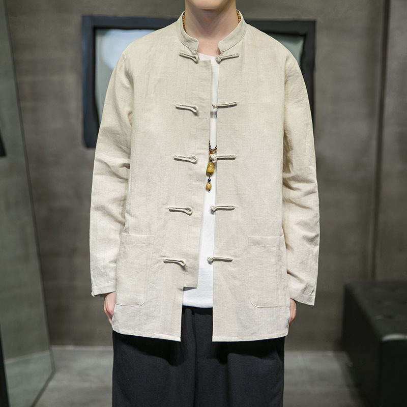 前身頃に配された布製のチャイナボタンが東洋風の上品な雰囲気を演出し、個性的な印象を与えます。