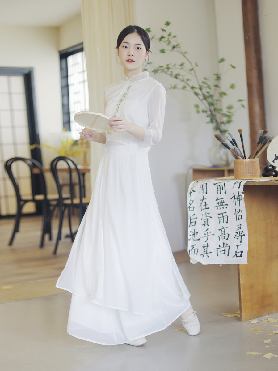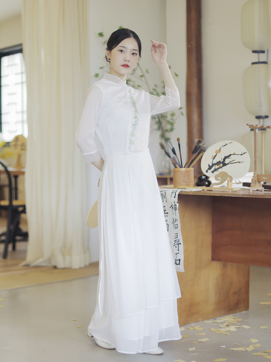 立ち襟とサイドの装飾が美しい中華風のスタイルで古典的な優雅さを演出