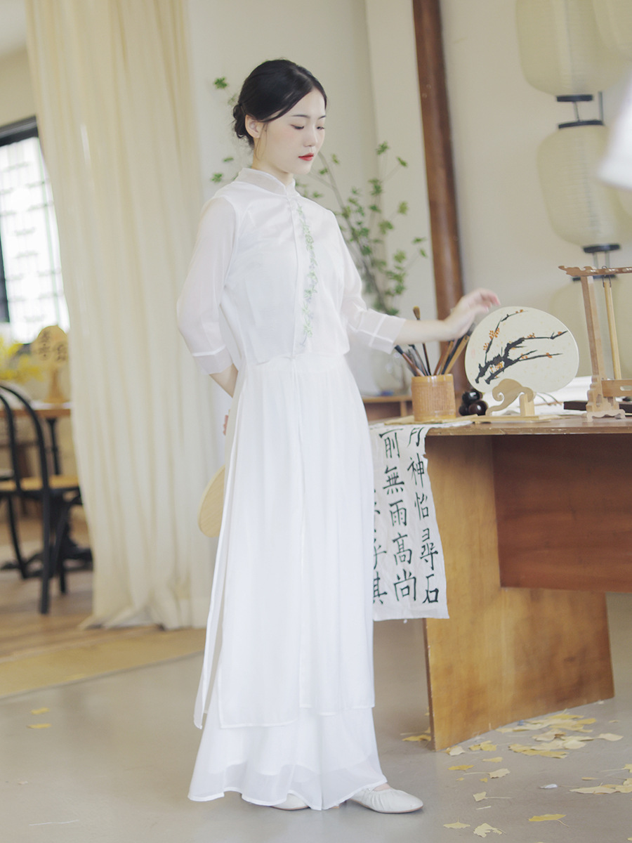 上品なスタンドカラーと斜めの合わせが特徴的で、胸元には繊細な花刺繍が施されています。