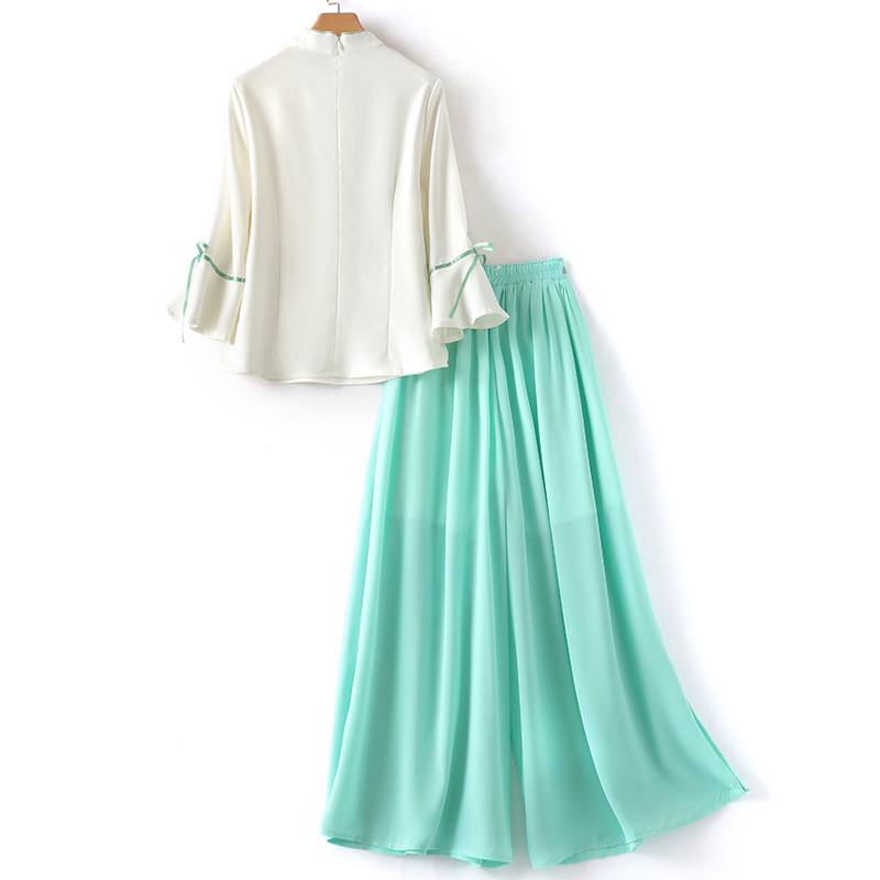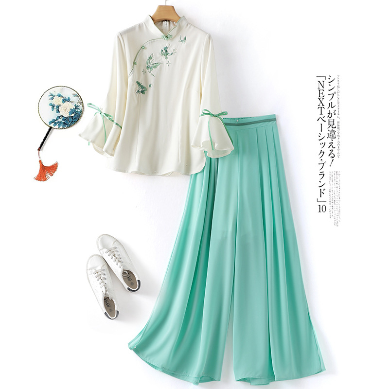 上品な花鳥刺繍が施されたチャイナ服風ブラウスと、ゆったりとしたプリーツワイドパンツの二点セットアップです。