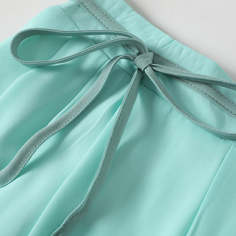 パンツは動きやすいワイド仕様で、プリーツが美しく揺れる優雅なシルエットが魅力です。