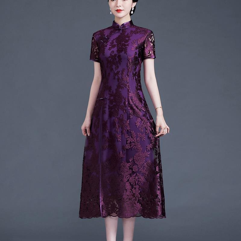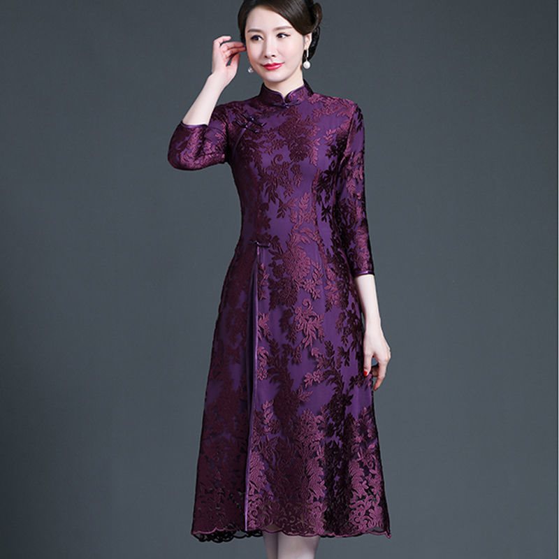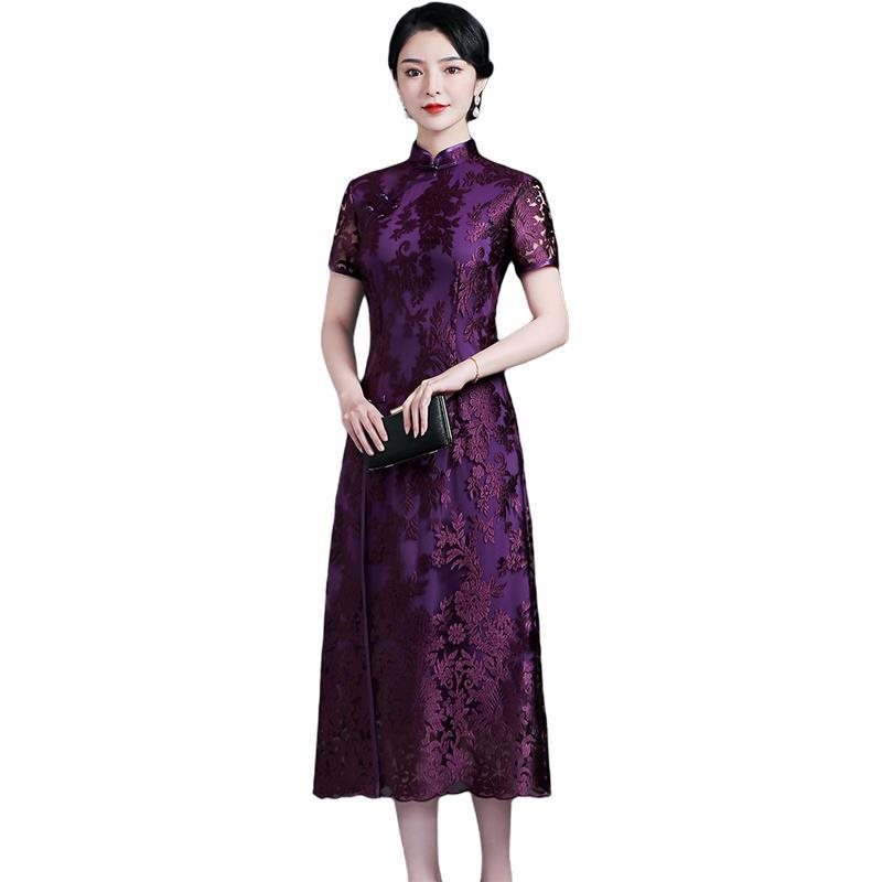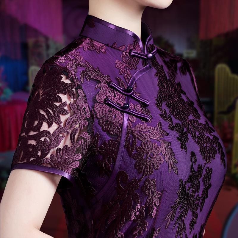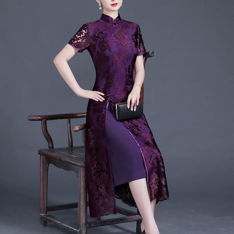 華やかな花柄の刺繍レースが全体に施された上品なチャイナ服のワンピースです。
