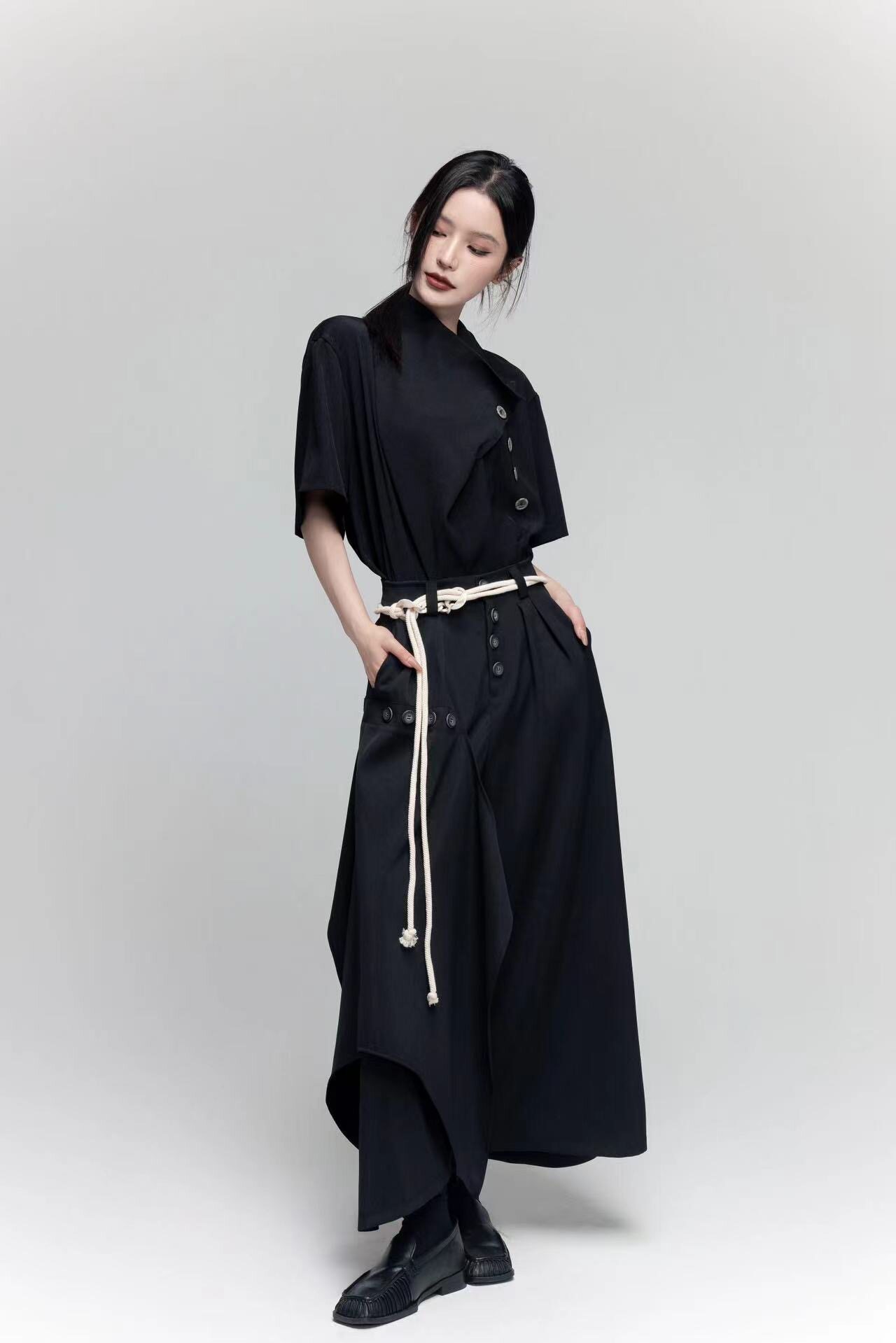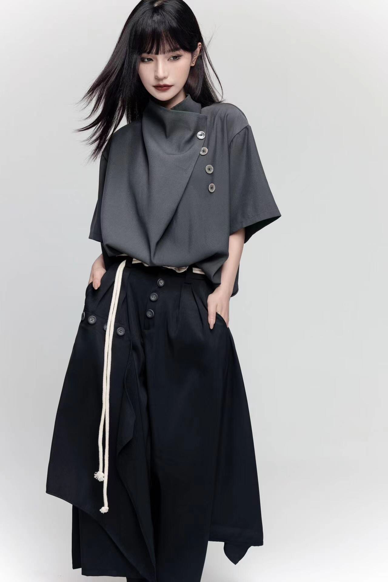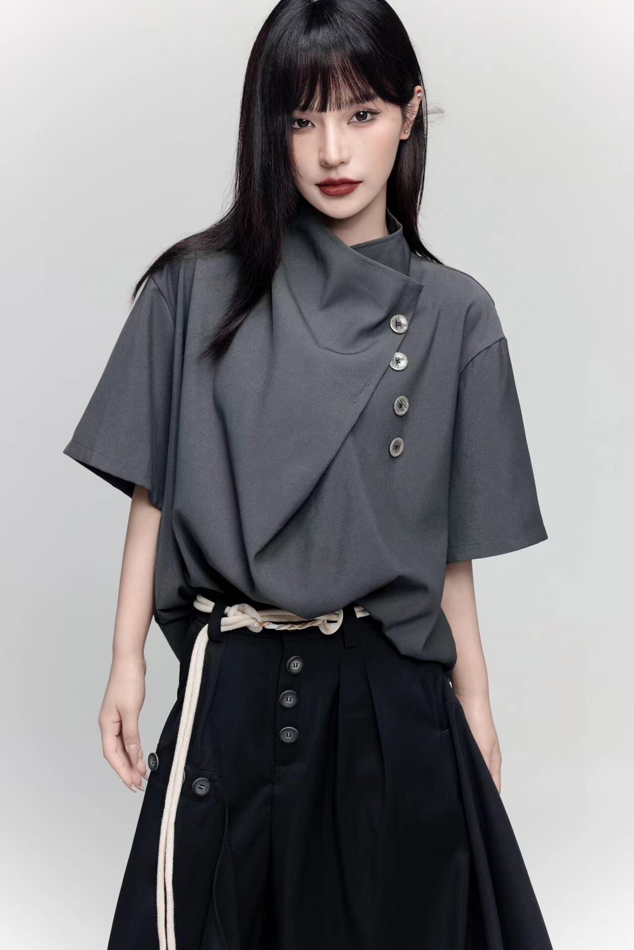伝統的なチャイナ服の要素を取り入れかつ、都会的で洗練されたシルエットが魅力のモードトップス。ユニークなアシンメトリーデザインと斜めに並んだボタンで柔らかく軽量な生地感で、着心地は快適。ゆったりしたシルエットは、パンツやスカートとのレイヤードスタイルにも最適です。シックなグレーはコーディネートに取り入れやすく、デイリーユースからオフィス、休日のお出かけまで幅広く活躍します。 特徴としては、立ち襟と斜めに配置された個性的なボタンデザインが特徴で、東洋の美意識と洗練されたモダンスタイルを融合させました。