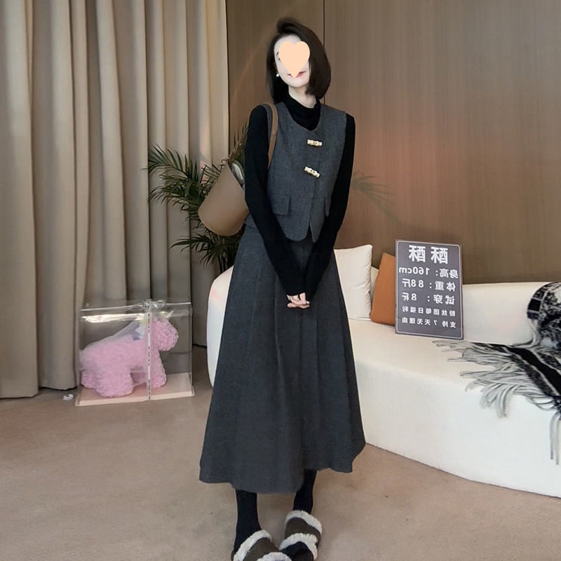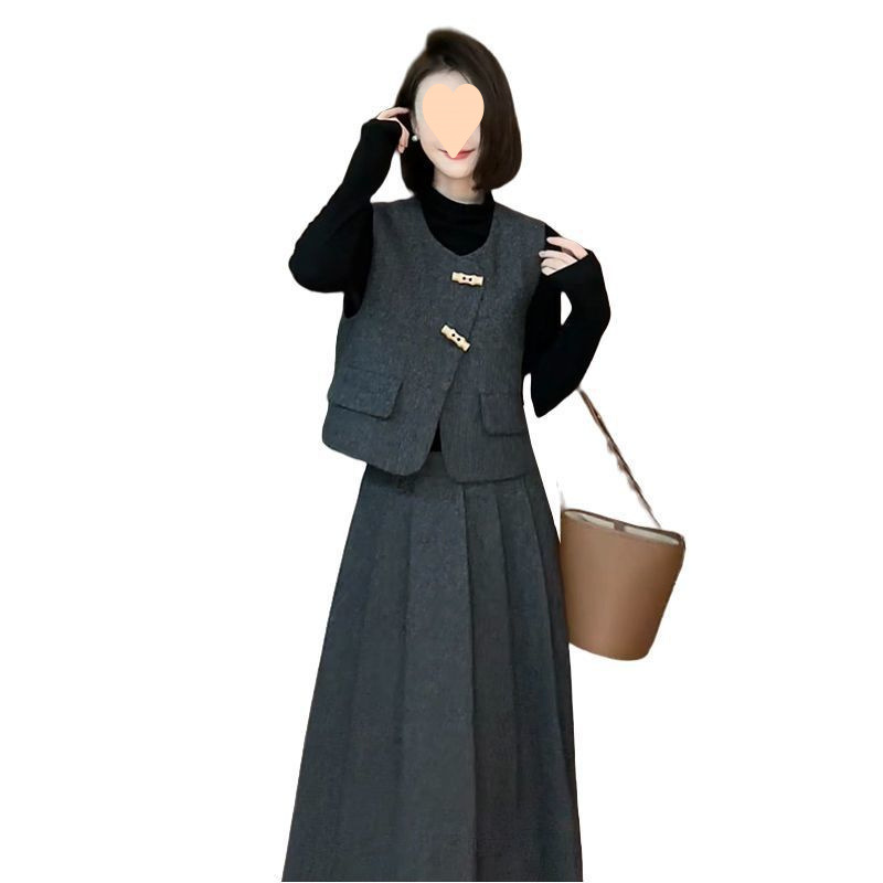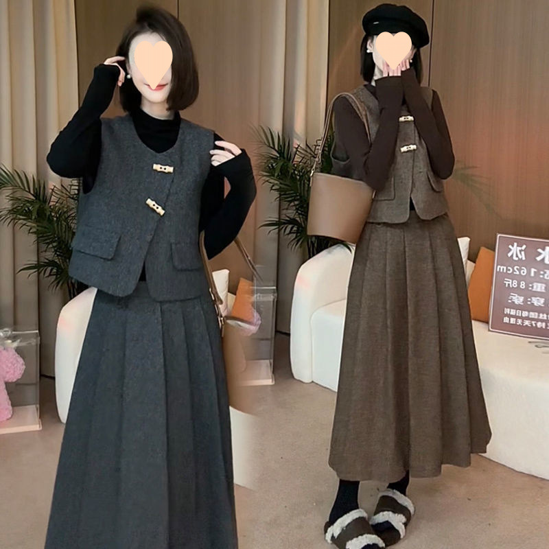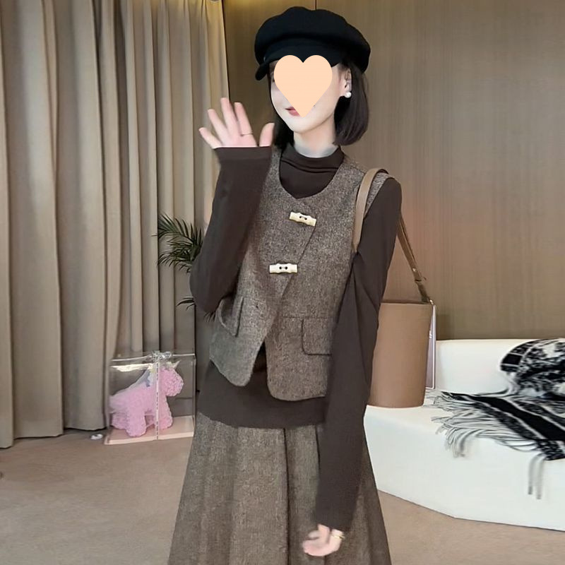 ベストとスカートの組み合わせが知的で洗練された印象を演出し、大人の女性らしさを引き立てます。