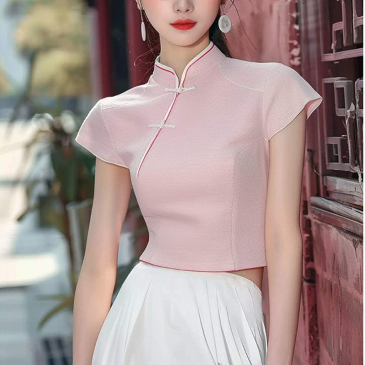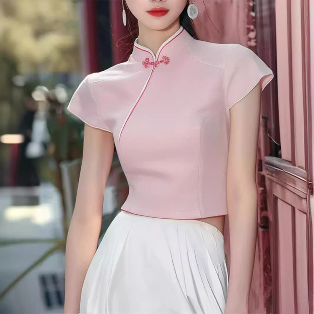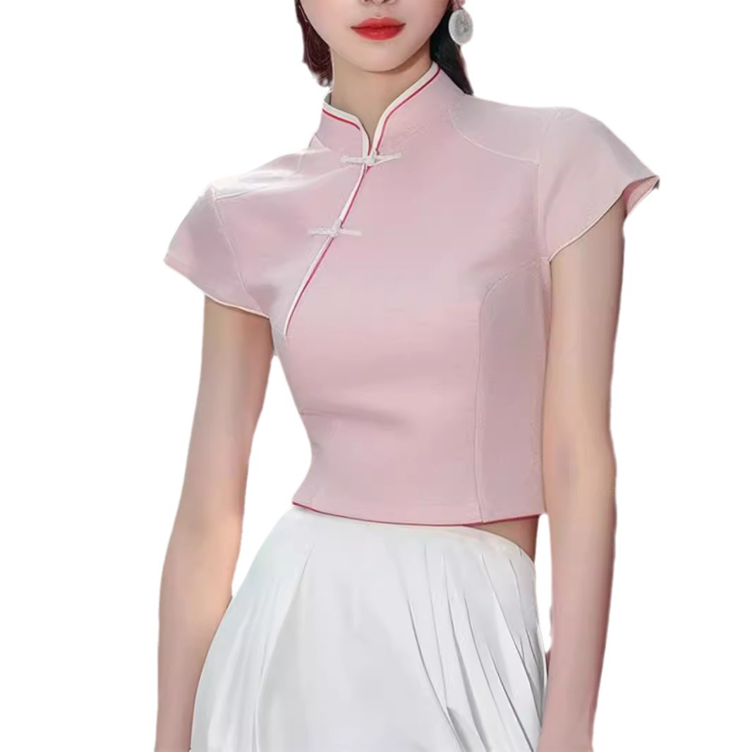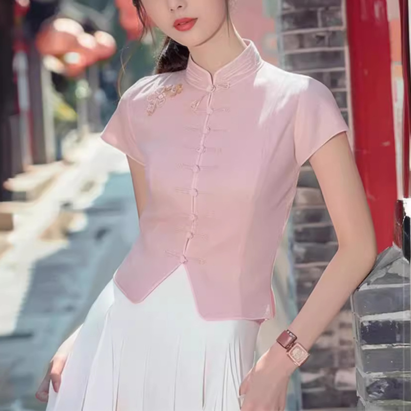 伝統的な立ち襟と美しい刺繍ボタンが特徴的なチャイナ服のシャツです。