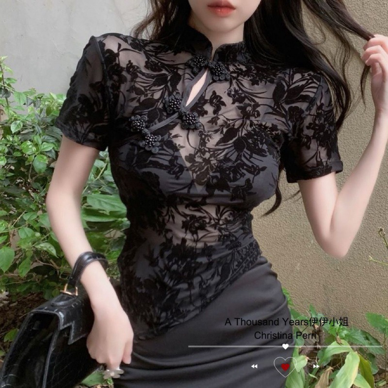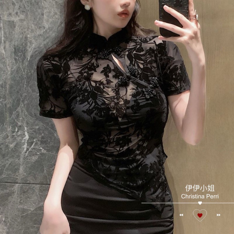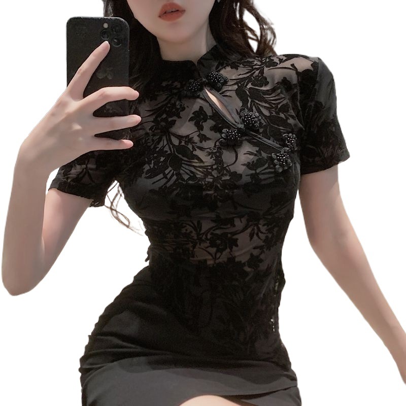 立ち襟とボタンが織りなすチャイナドレス風のデザインで、エレガントな雰囲気を醸し出す
