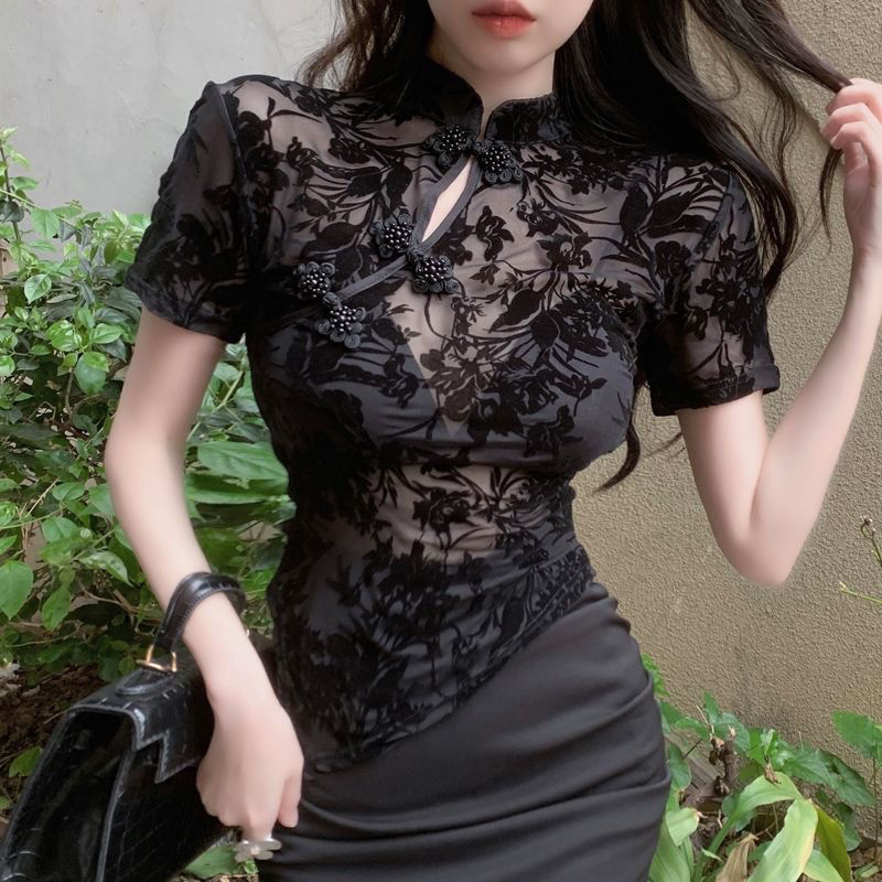立襟デザインと半袖の組み合わせが伝統的な美しさを保ちながら、現代的な着こなしも可能です。