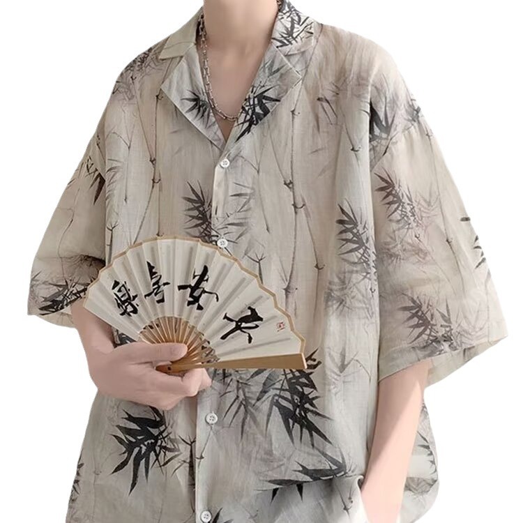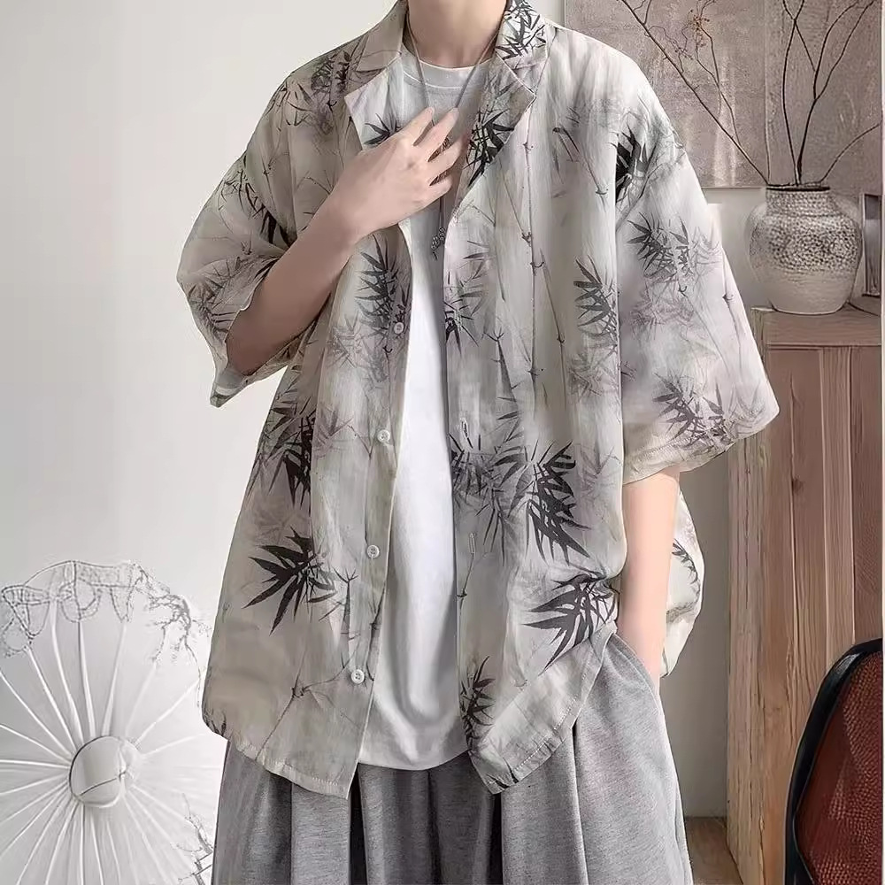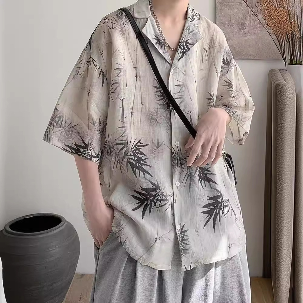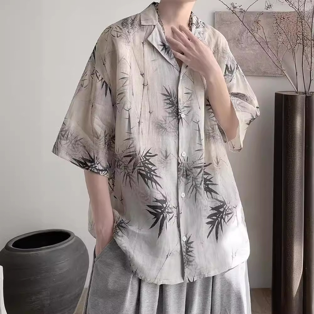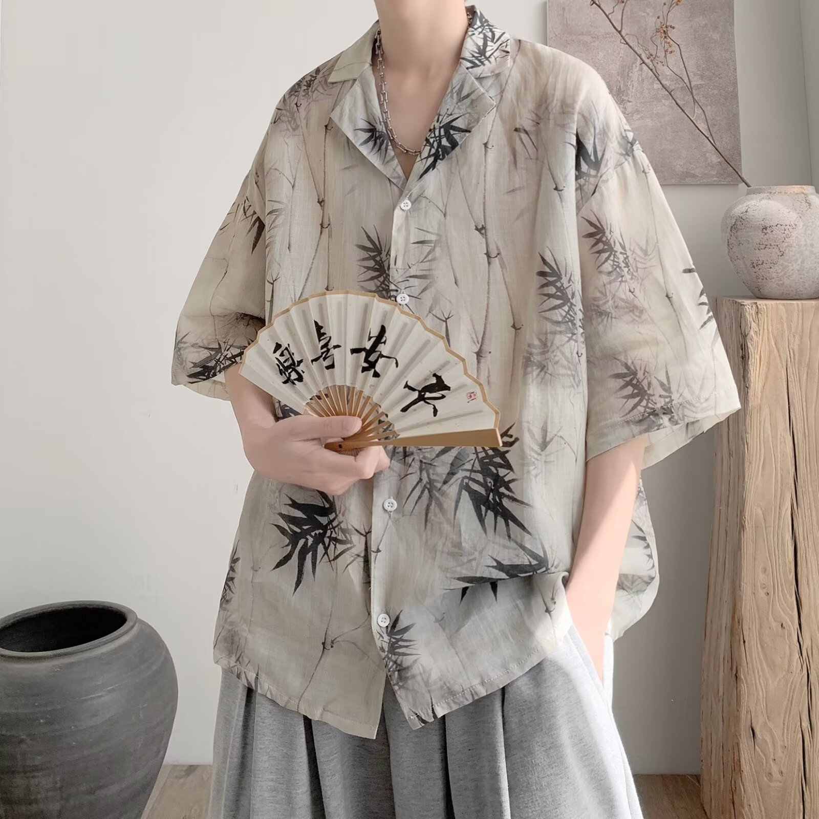 伝統的な水墨画のような竹の柄が全体に描かれた風情あふれるチャイナ服のシャツです。