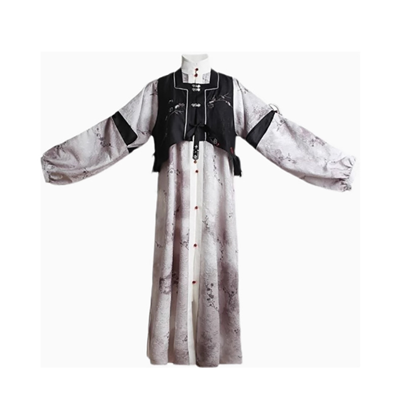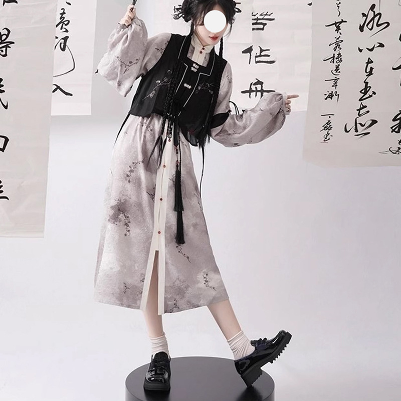 黒のベストと淡い色合いのワンピースの組み合わせで古典的で洗練された印象を演出