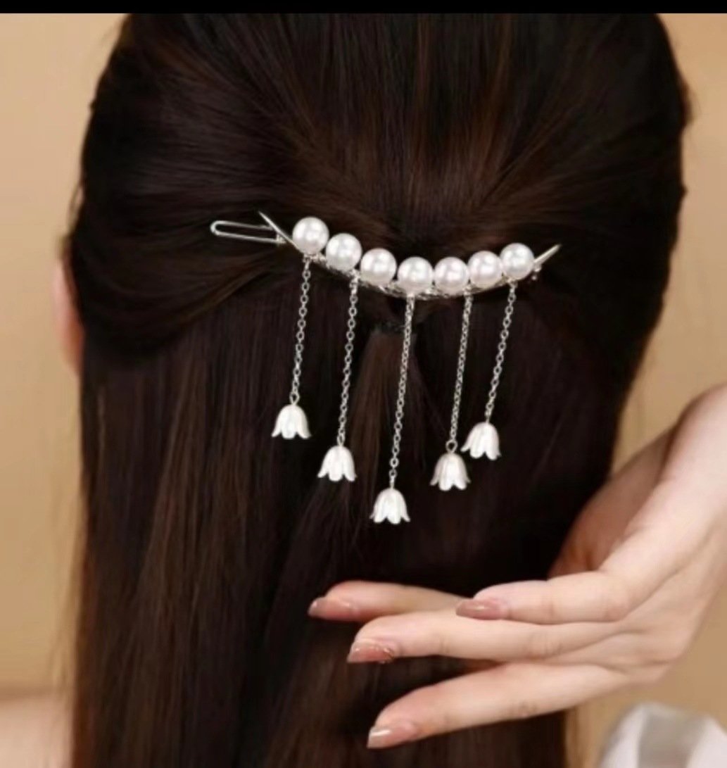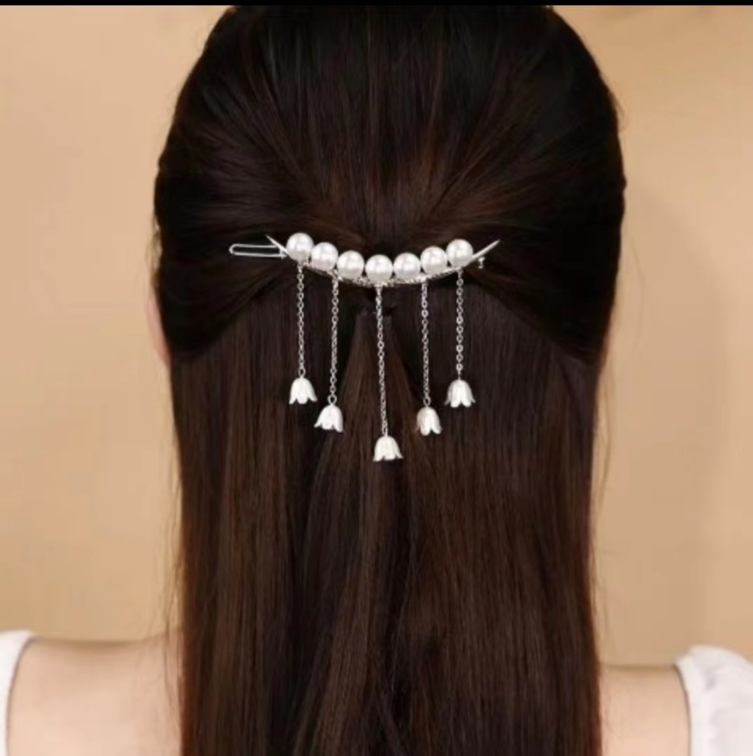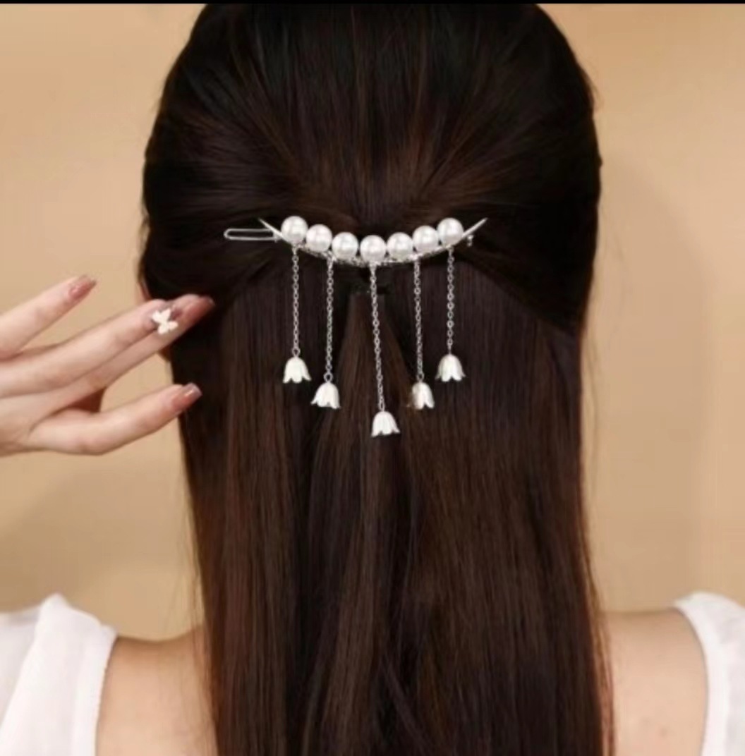 優雅な鈴蘭の花をモチーフにした揺れるタイプの髪飾りです。 並んだパールビーズから垂れ下がる繊細なチェーンと小さな花飾りが、動くたびに上品に揺れて華やかさを演出します。 チャイナ服との相性が抜群で、まとめ髪やハーフアップスタイルにも簡単に装着できます。 結婚式やパーティーなどの特別な日から、日常のおしゃれまで幅広くお使いいただける上品なデザインの髪飾りです。