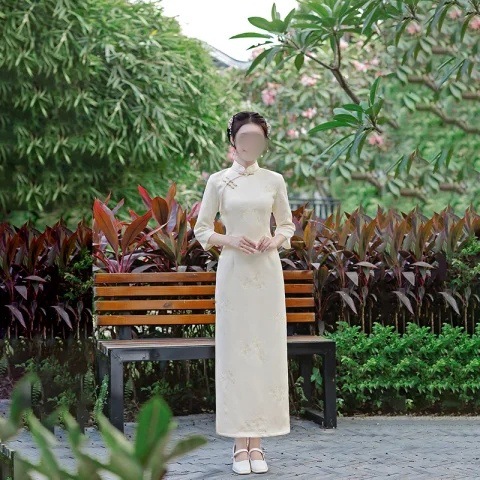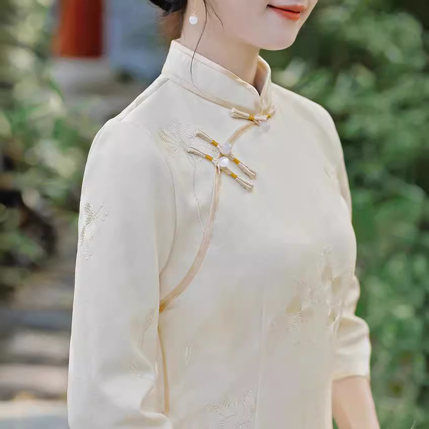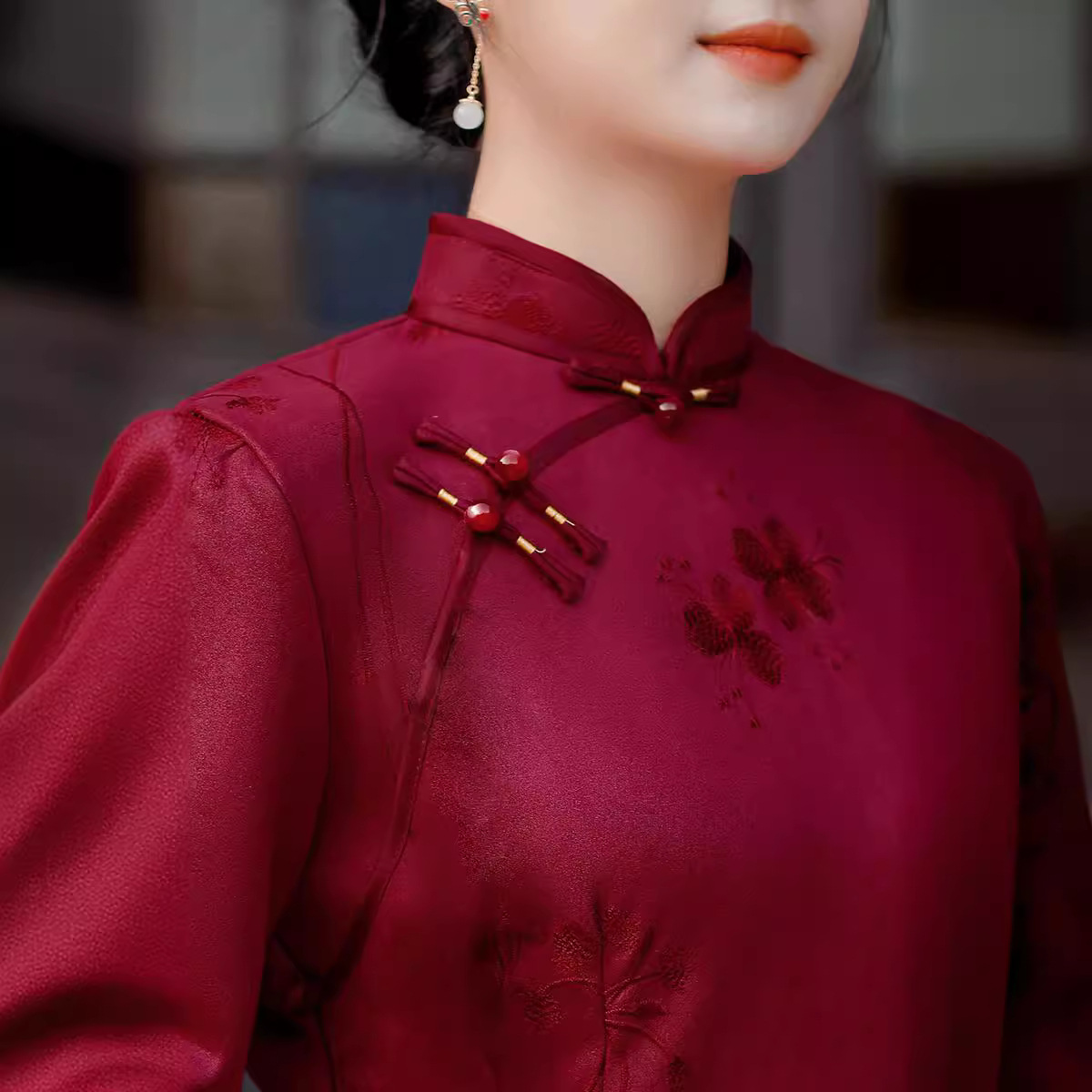 首元の美しいチャイナボタンが東洋的な elegance を演出し、上品で洗練された印象を与えます。
