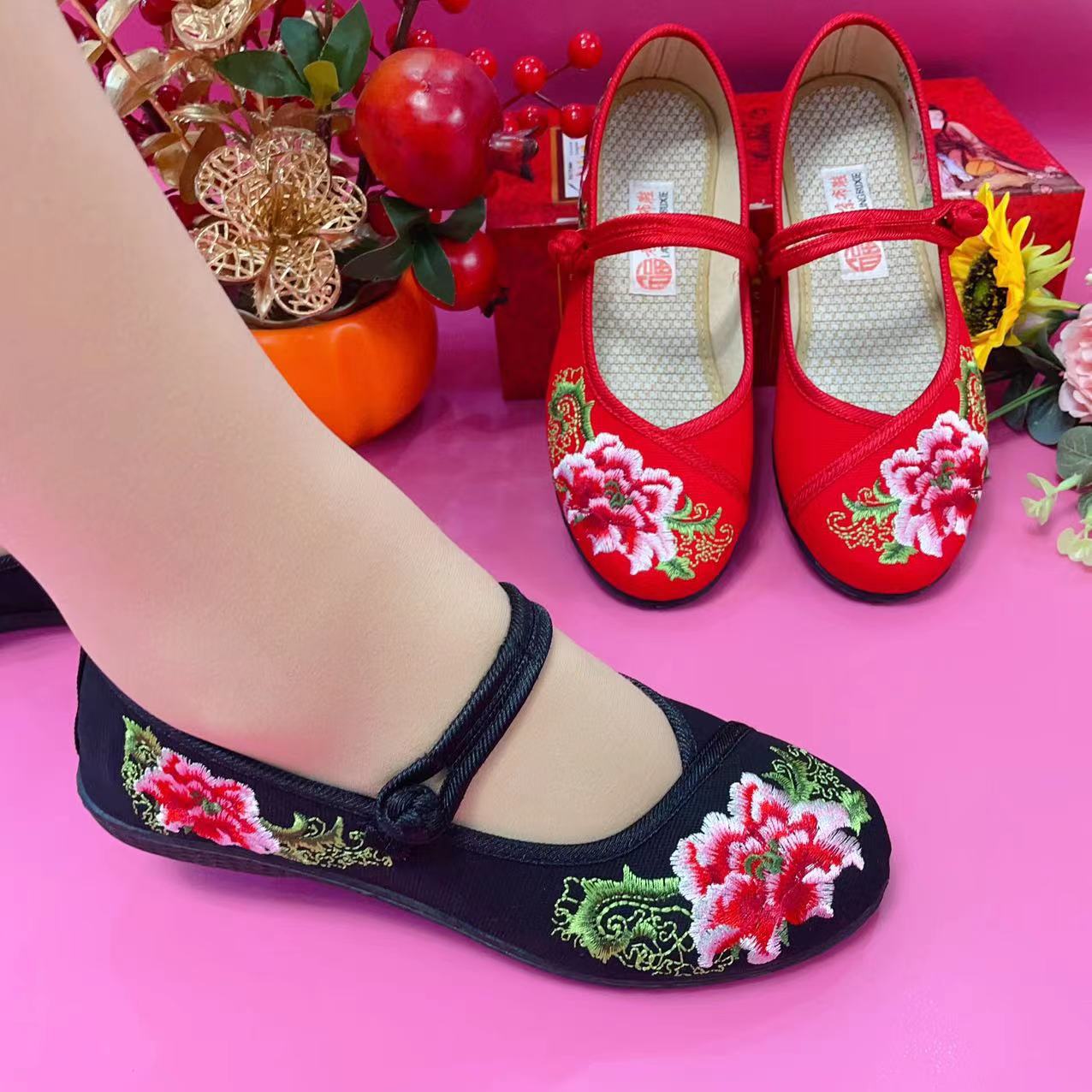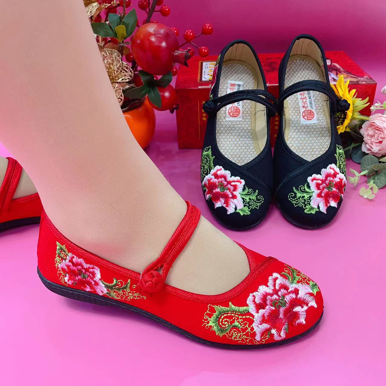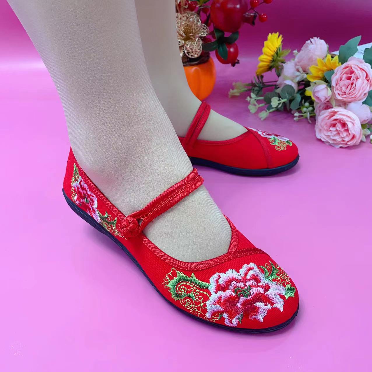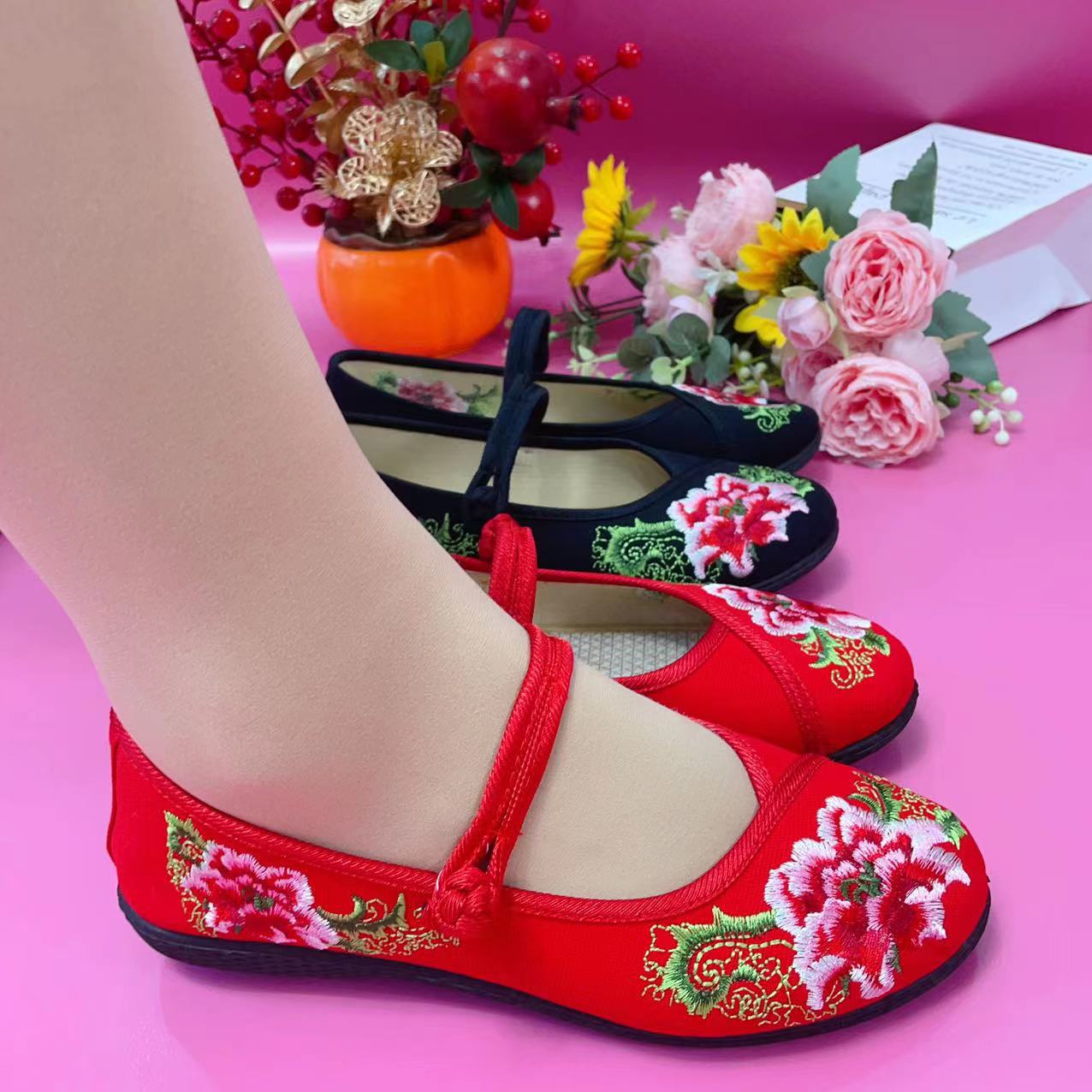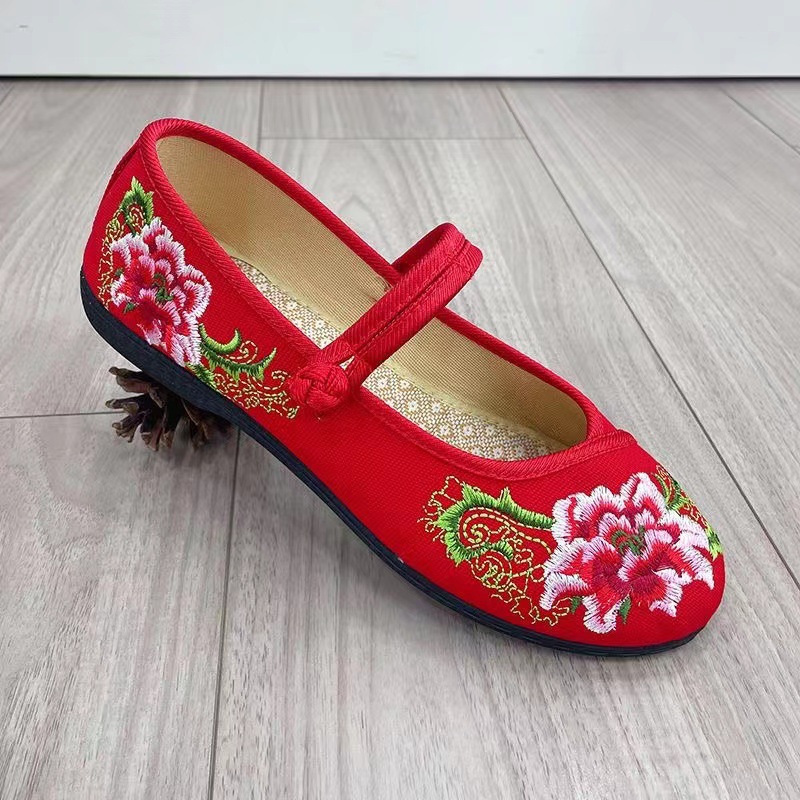 伝統的なチャイナ服に合わせて作られた上品な布製のシューズです。 甲部分に華やかな牡丹の花を刺繍で施し、唐草模様が美しいアクセントを添えています。 足を優しく包み込む柔らかな素材と、歩きやすい平底仕様で長時間の着用も快適です。 ストラップ付きで脱げにくく、普段使いから特別な日の装いまで幅広く活躍します。 東洋の伝統美を現代的に表現した、おしゃれで履き心地の良い一足です。