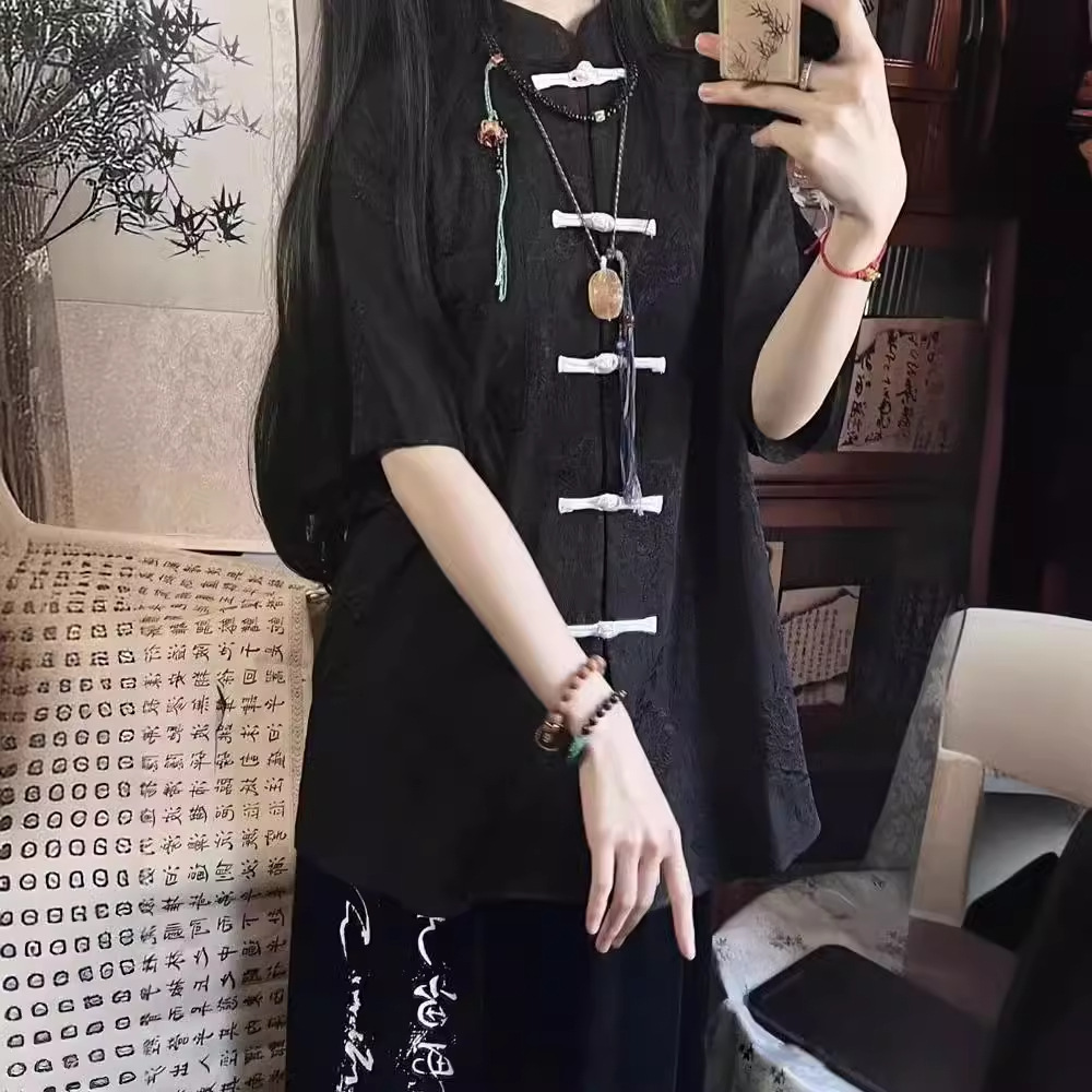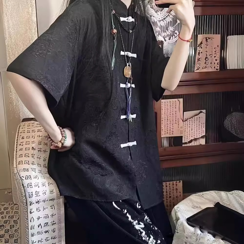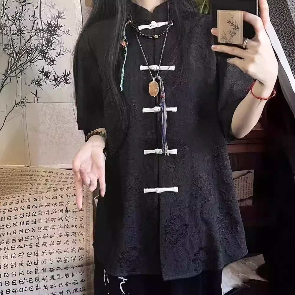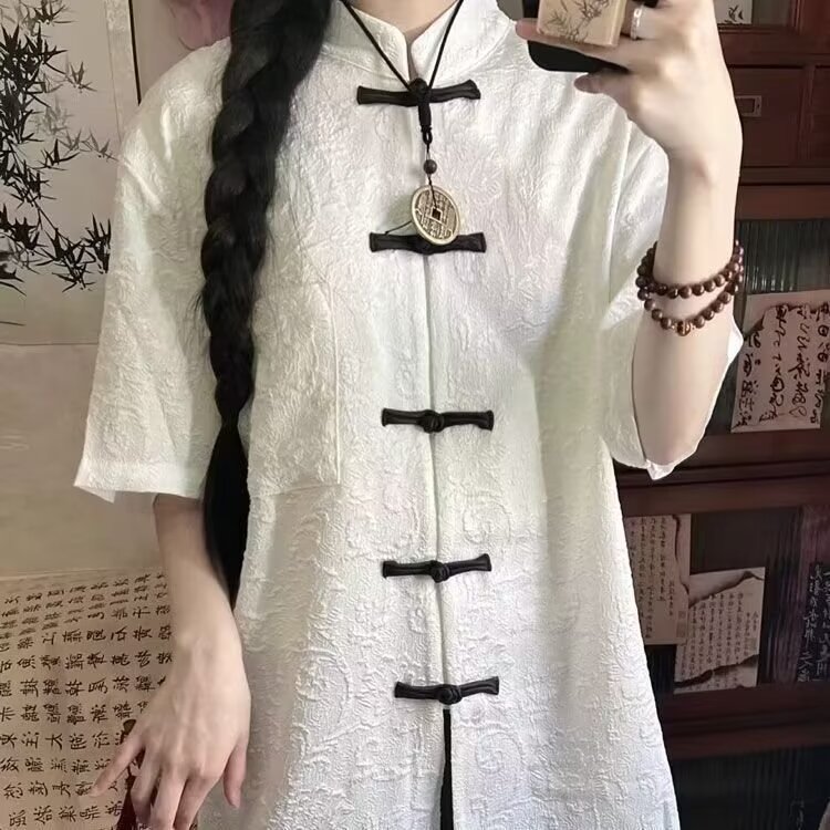 やさしい風合いのホワイトに、チャイナ風のデザインが可愛らしく映えるトップス。 繊細な織り模様と、ころんとした結びボタンがアクセントになり、上品さの中にほんのり愛らしさを添えてくれます。 ゆったりとしたシルエットで、リラックスした着心地も魅力。さらっと一枚で着るだけで、ナチュラルでこなれた雰囲気に仕上がります。 パンツにもスカートにも合わせやすく、普段のお出かけやおうち時間にもぴったり。 気負わず可愛さを楽しみたい日に、そっと寄り添ってくれる一着です。