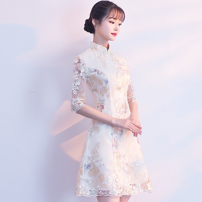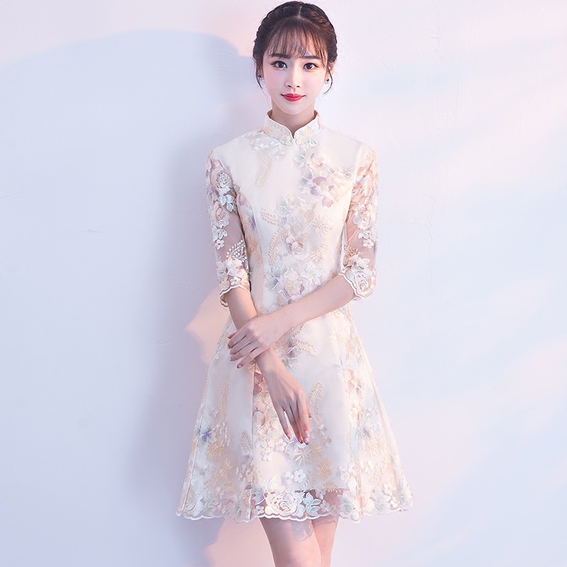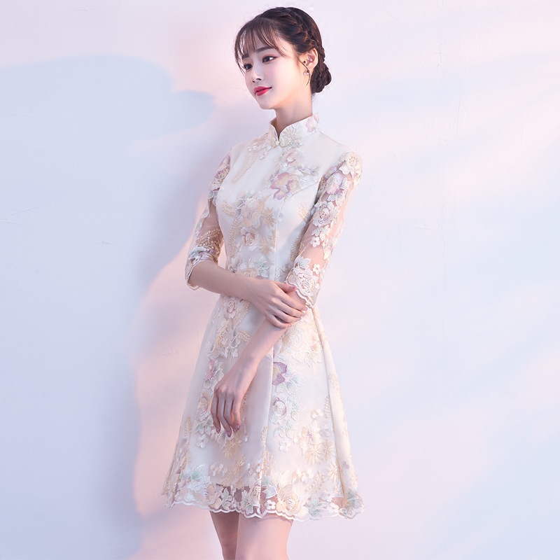 伝統的なチャイナ襟と前合わせのデザインが、女性らしいシルエットを作り出します。