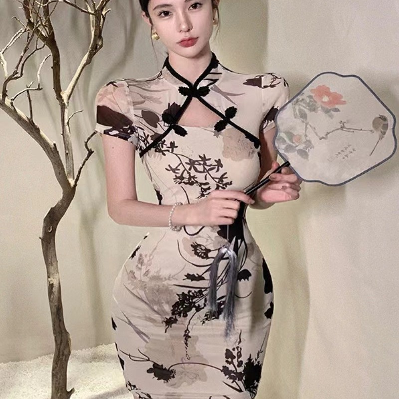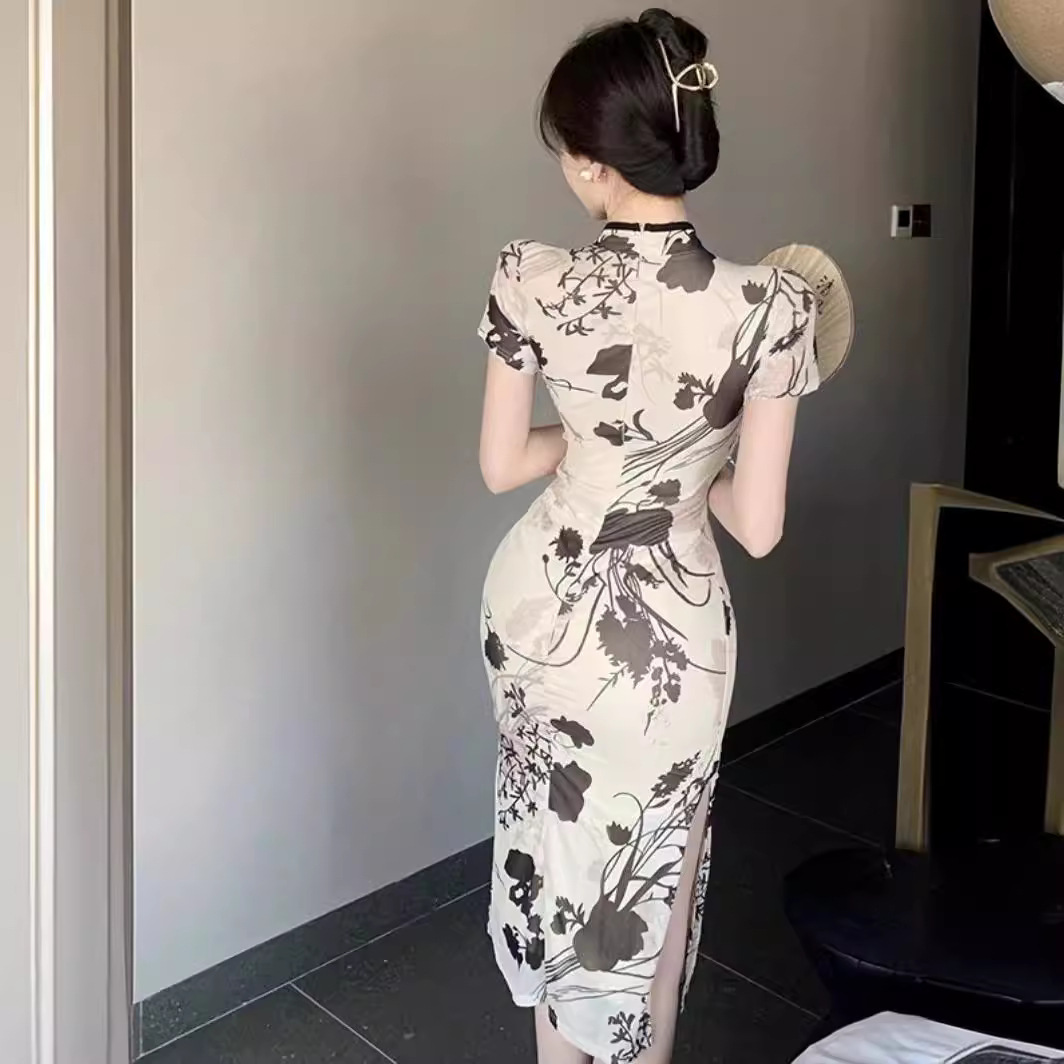 立ち襟と前身頃のボタン留めディテールが東洋の美しさを表現し、エレガントで上品な雰囲気を醸し出す