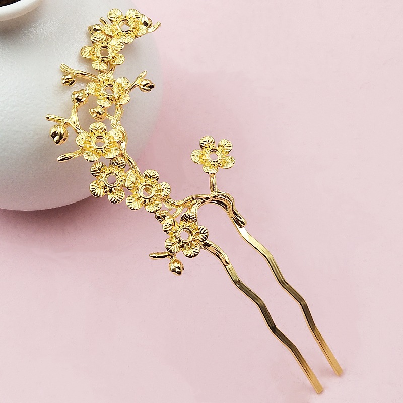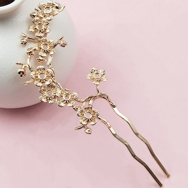繊細な梅の花と枝を立体的にデザインした華やかな髪飾りです。 優美な曲線を描く枝に小花が連なり、チャイナ服の装いに上品な華やかさを添えます。 二本足のかんざしタイプでしっかりと髪に固定でき、まとめ髪を美しく演出します。 結婚式や成人式などの特別な日から普段使いまで幅広くお使いいただける逸品です。 伝統的な東洋美を現代的にアレンジした優雅なデザインが魅力です。