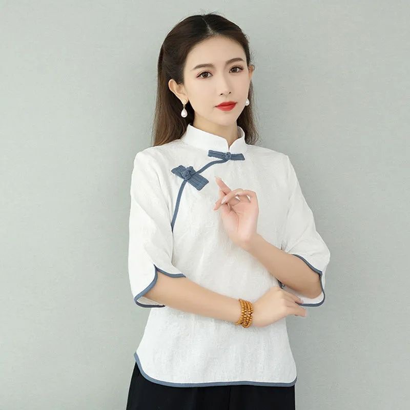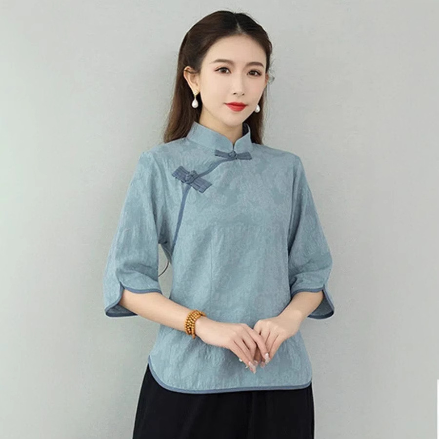 胸元の斜めに配置されたチャイナボタンが東洋的な優雅さを演出し、洗練された大人の雰囲気を作り出します。