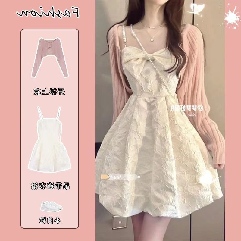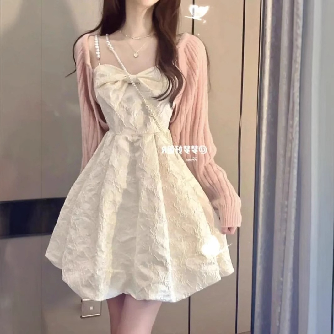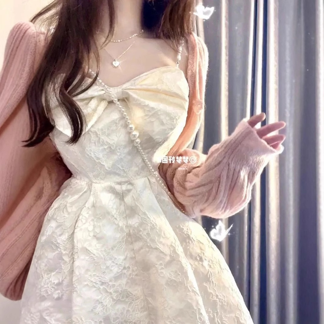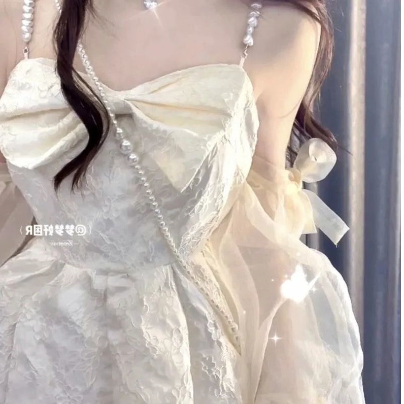 繊細な刺繍と蕾絲素材が華やかな印象を与えるチャイナ服です。 肩紐はリボン結びのデザインで可憐さを演出し、調節も可能です。 ふんわりと広がる裾のシルエットが女性らしさを引き立て、特別な日のお出かけにぴったりのワンピースです。 別売りのニットカーディガンを羽織れば季節の変わり目にも対応でき、着回しの幅が広がります。 上品で清楚な雰囲気を纏いたい方におすすめの一着です。