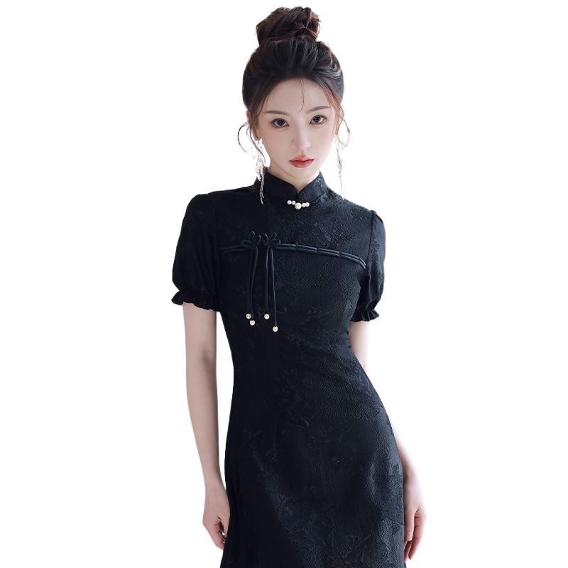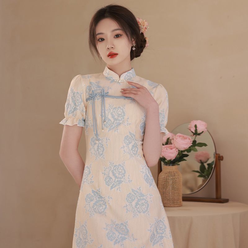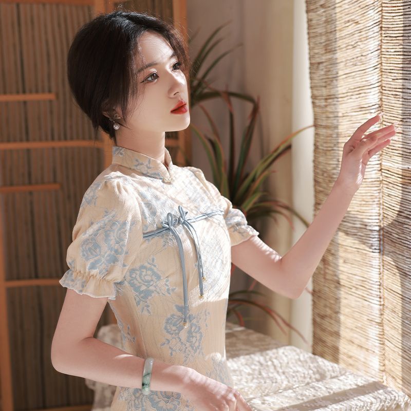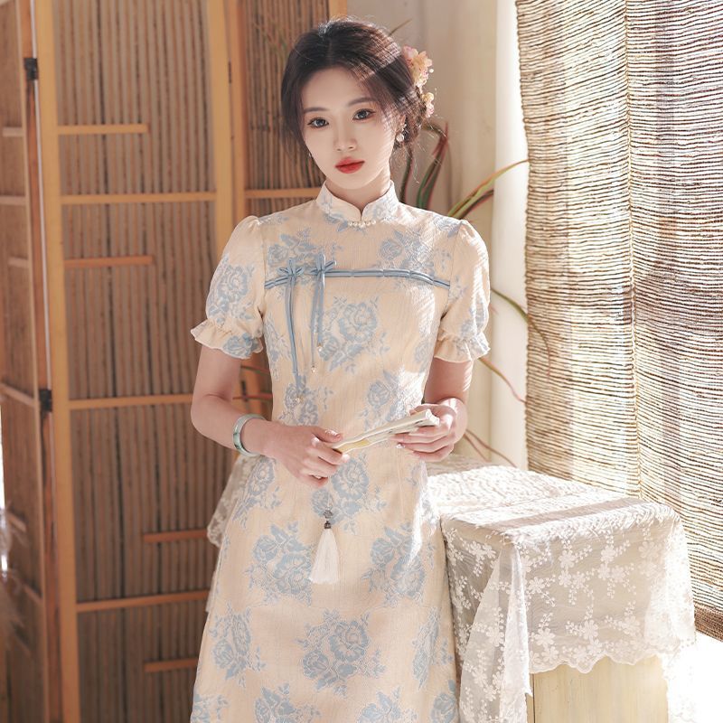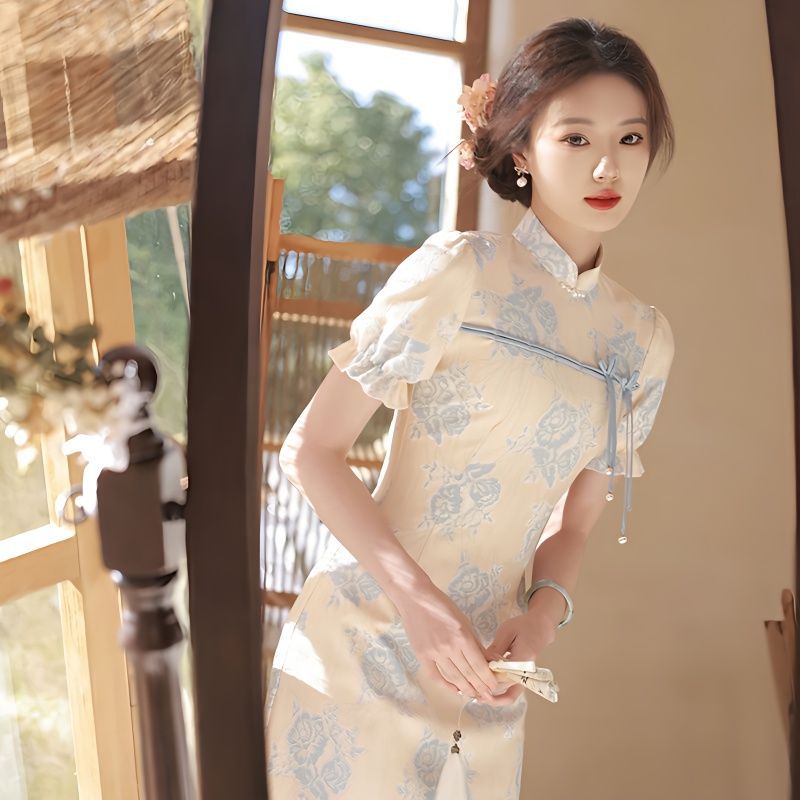 可愛らしいパフスリーブと立襟が女性らしさを引き立て、胸元のチャイナボタンが伝統的な雰囲気を演出します。
