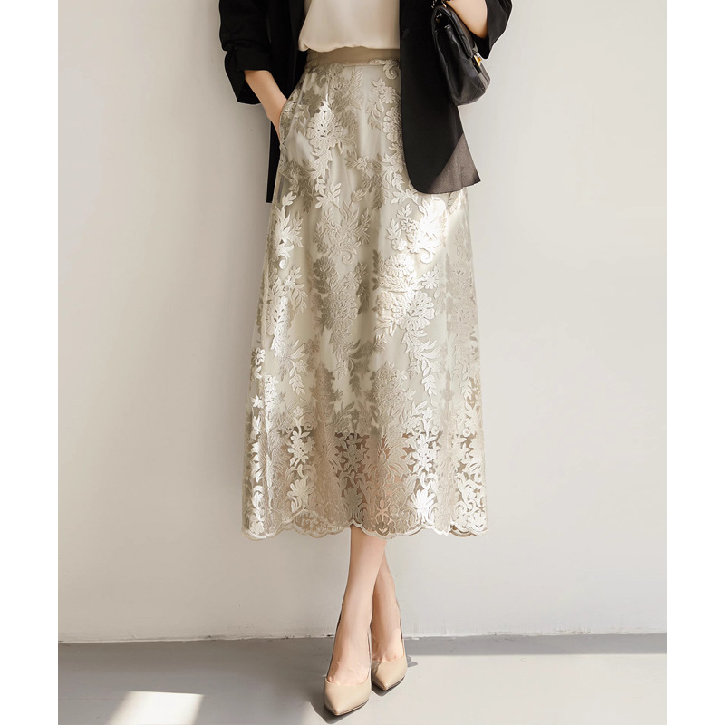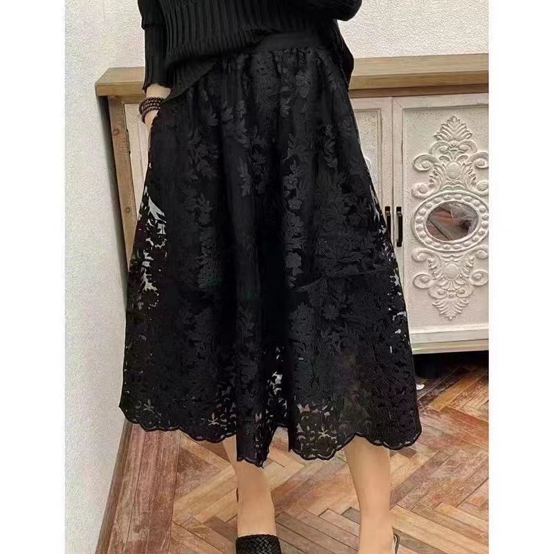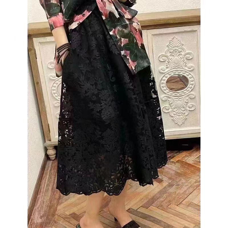 繊細な花柄の総刺繍レースが目を引く、上品で華やかなチャイナ服スカートです。 裾まで施された美しい刺繍が、歩くたびに優雅に揺れ動きます。 ふんわりと広がるフレア型のシルエットが女性らしさを引き立て、特別な日の装いにも普段使いにも最適です。 ウエストはゴム仕様で着心地も抜群、長時間の着用でも快適にお過ごしいただけます。 透け感のあるレース素材が軽やかで、季節を問わず着回せる万能なスカートとなっております。