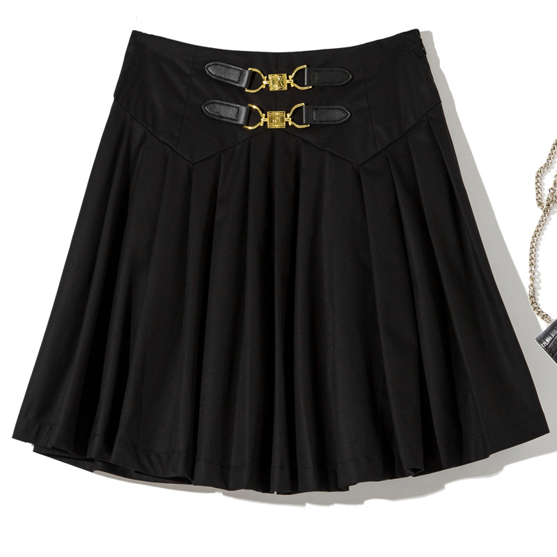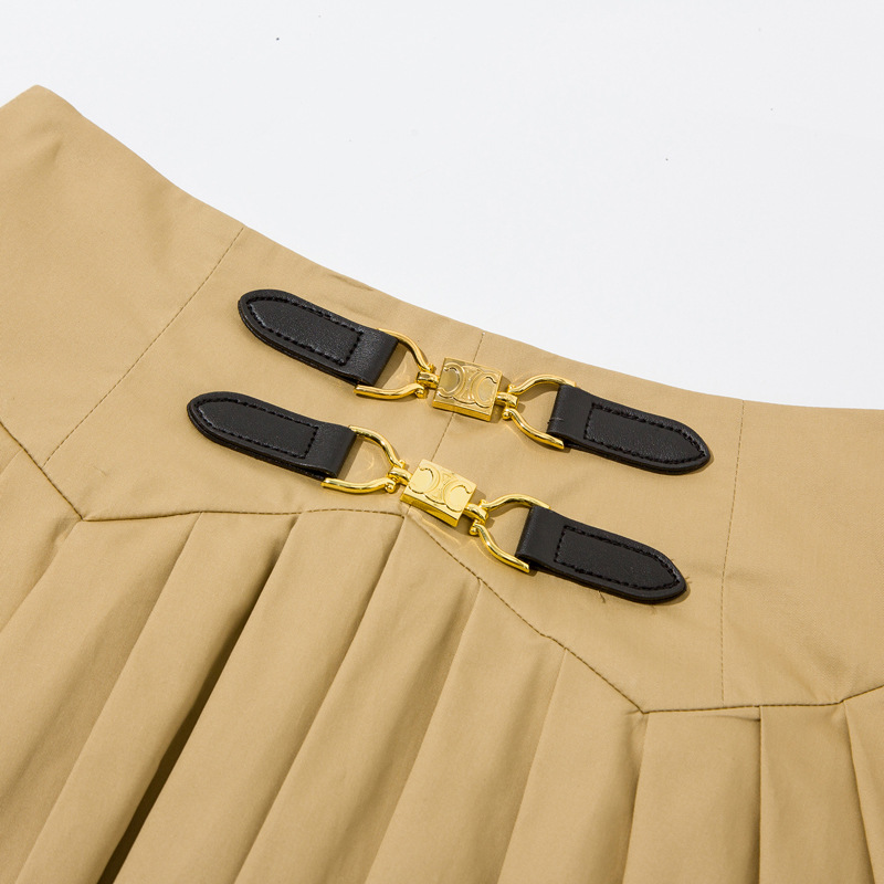 ウエスト部分の金具とレザー調バックルがアクセントとなり、品のある大人な装いに