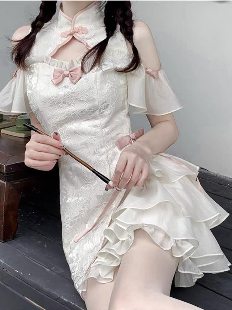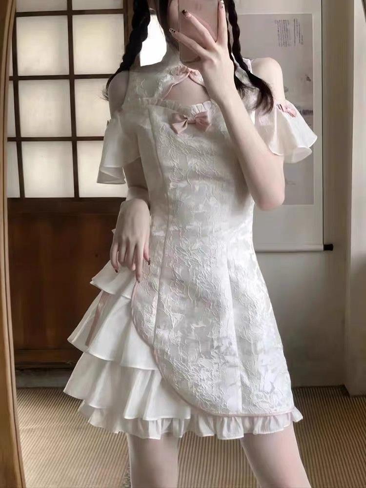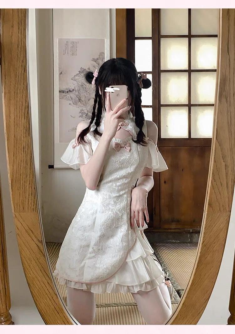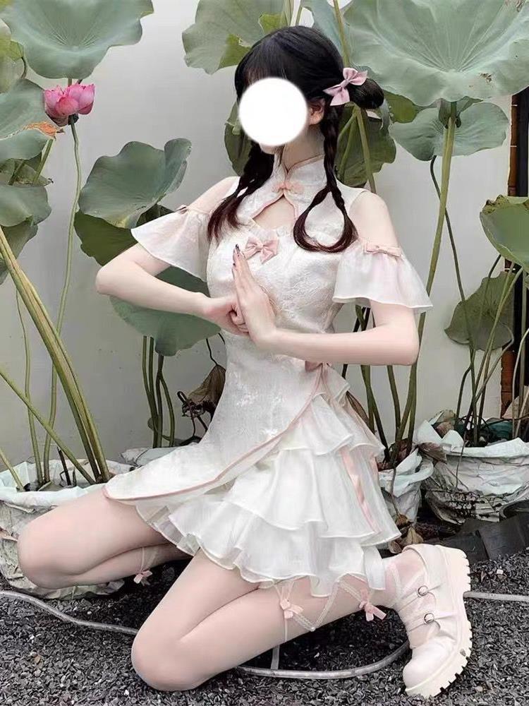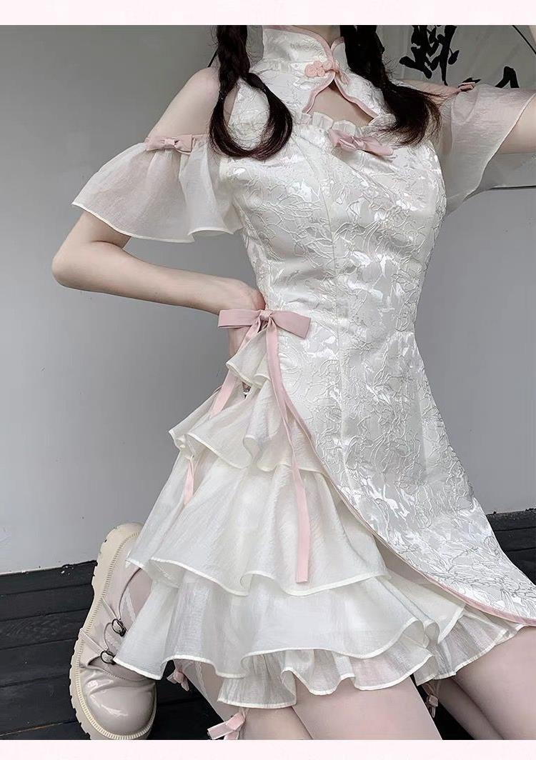 チャイナ襟と胸元のリボンディテールが可愛らしいアクセントになっており、特別な日のお出かけにもぴったりです。