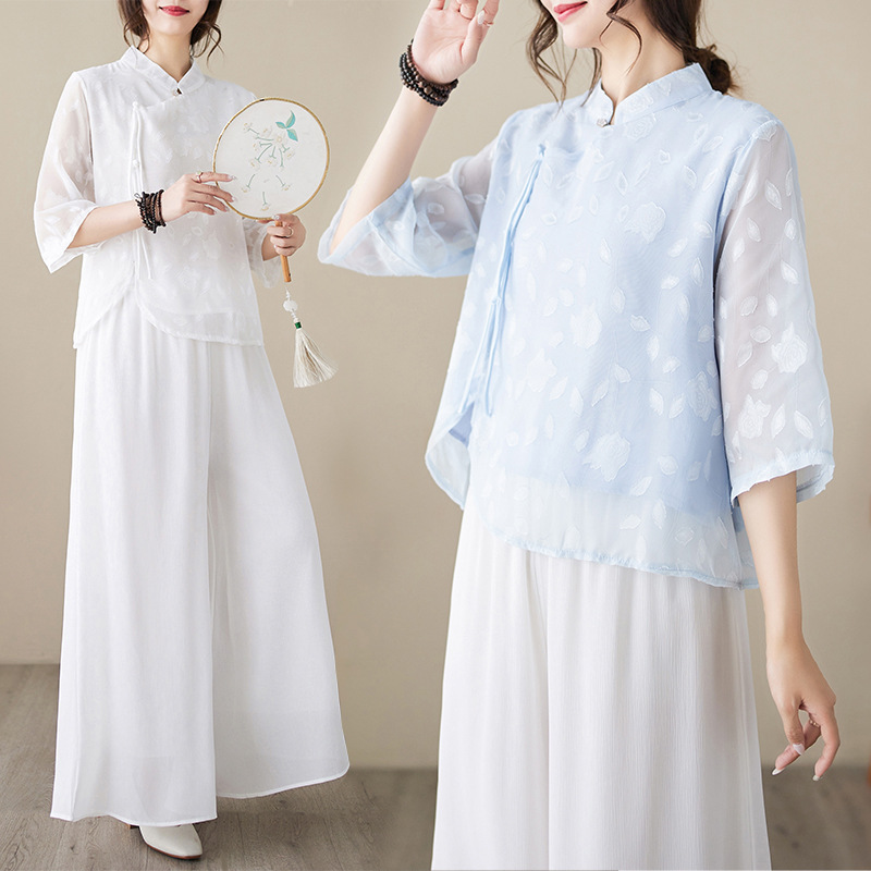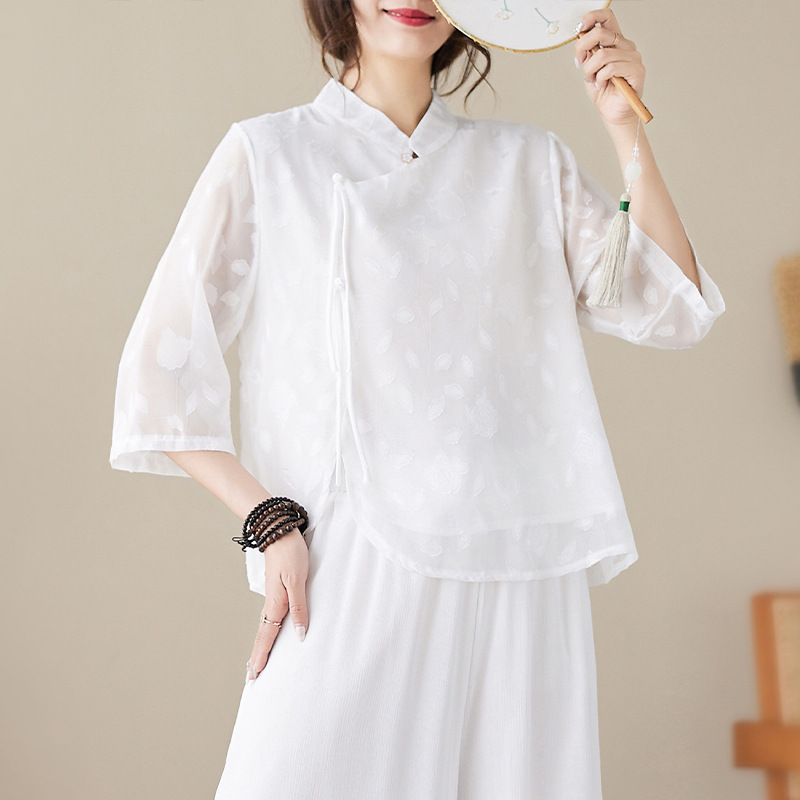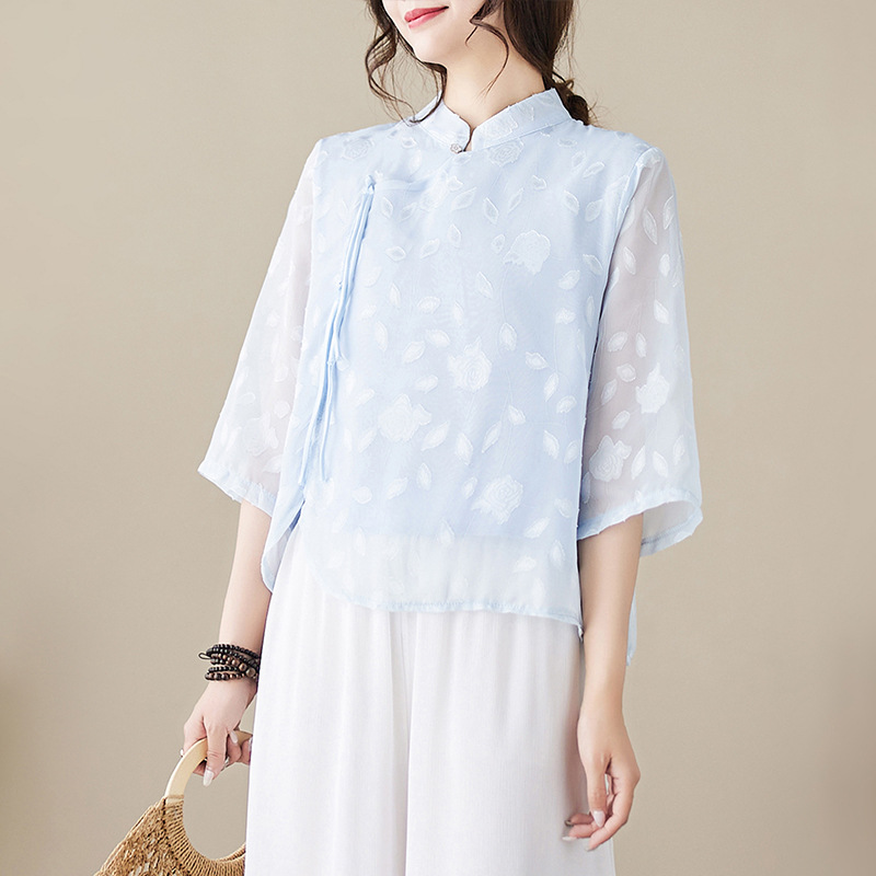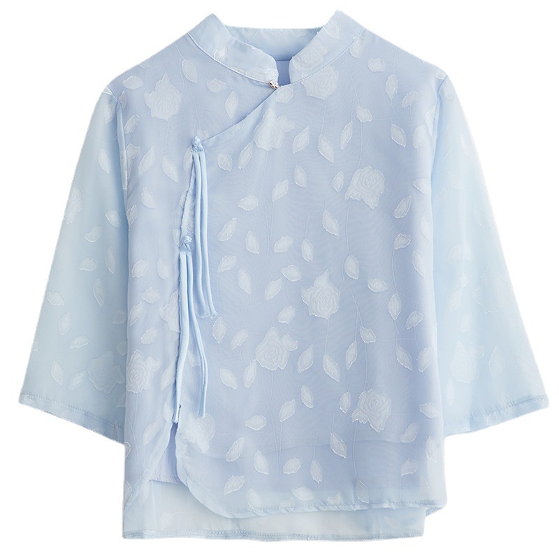 これからの季節にぴったり!やわらかな透け感が魅力の、上品なチャイナ風シャツです。